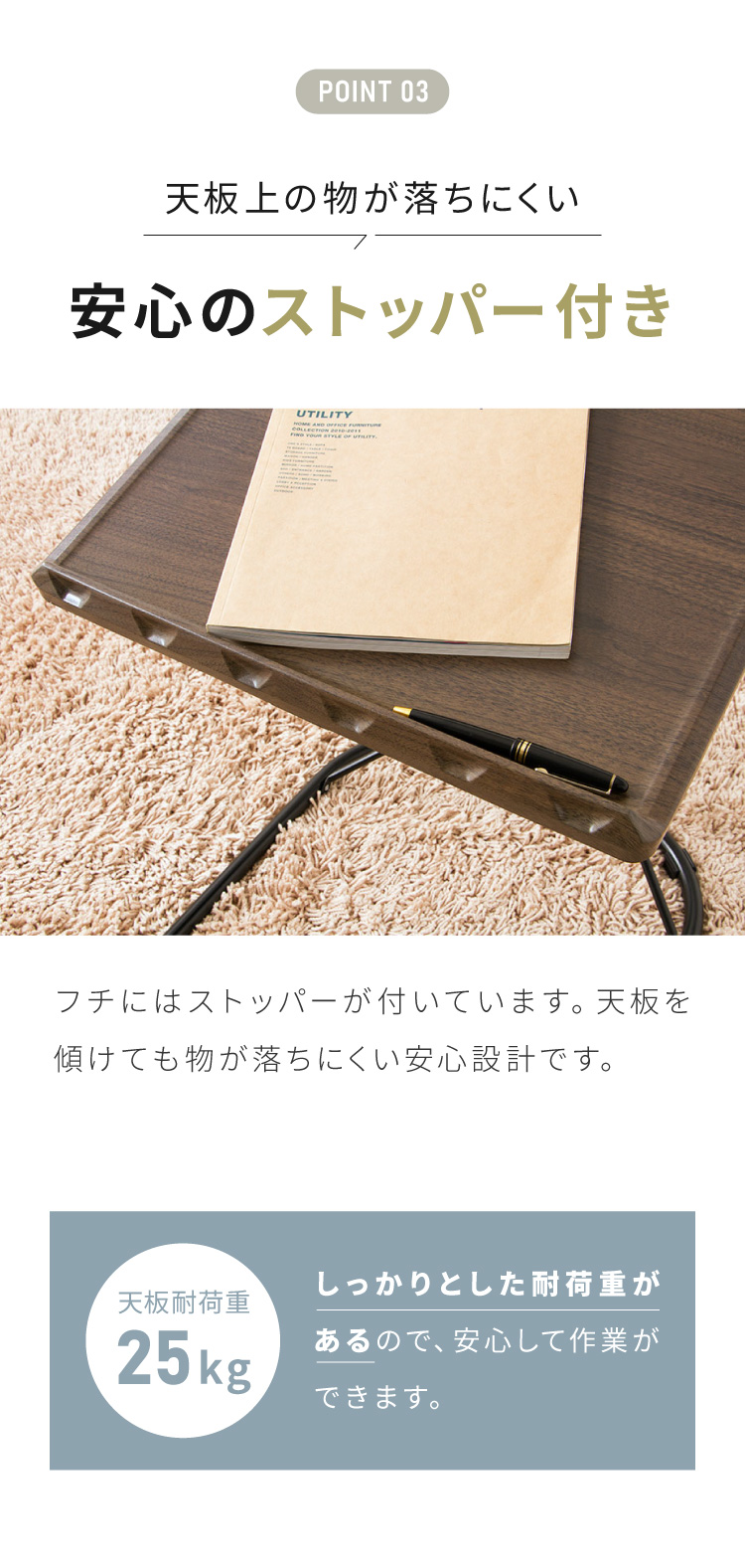 天板の下部はズレ落ち防止の返し構造になっており、角度をつけても使いやすい構造です。