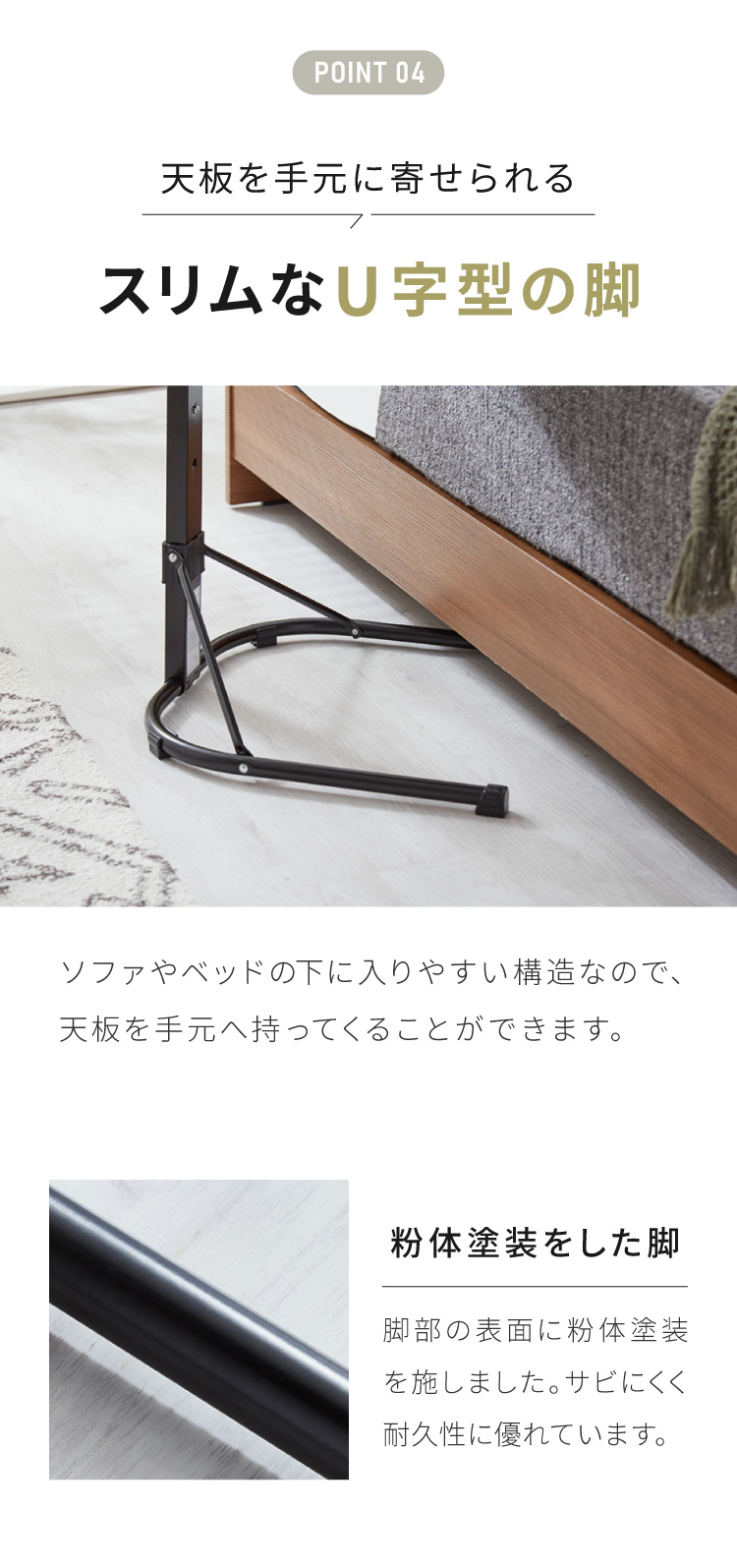 U字の足でソファやベッド下の隙間に入りやすい構造です。