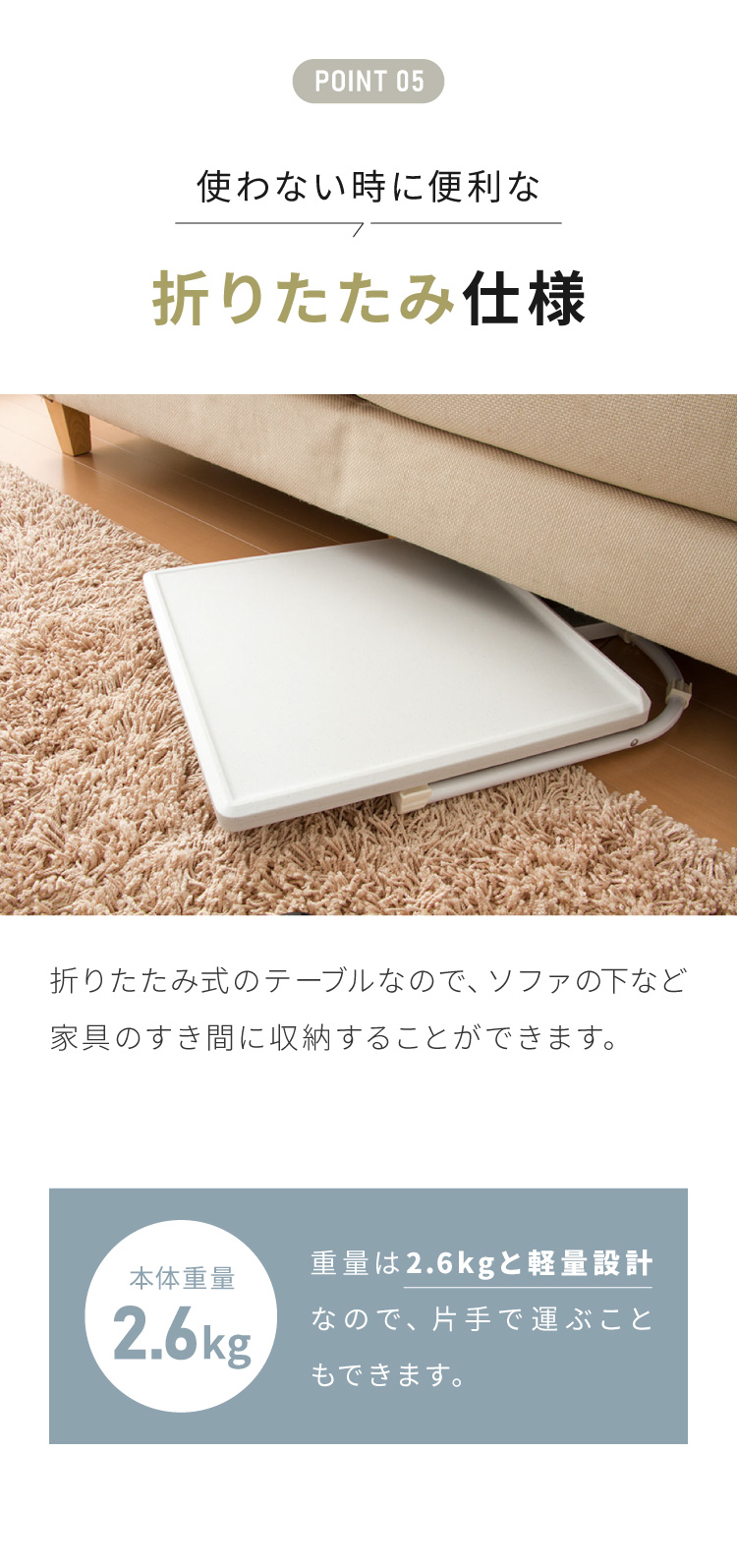折り畳むと厚み8cmになり、隙間に簡単収納ができます。