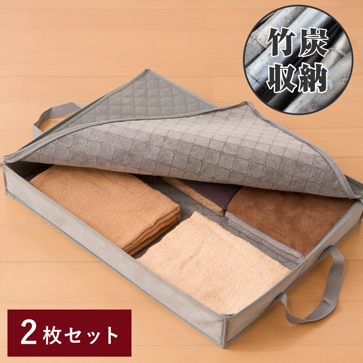 竹炭収納袋 サイドファスナー収納ボックス 2枚入り 折りたたみ クローゼット収納 収納BOX 収納ボックス 収納用品 隙間収納