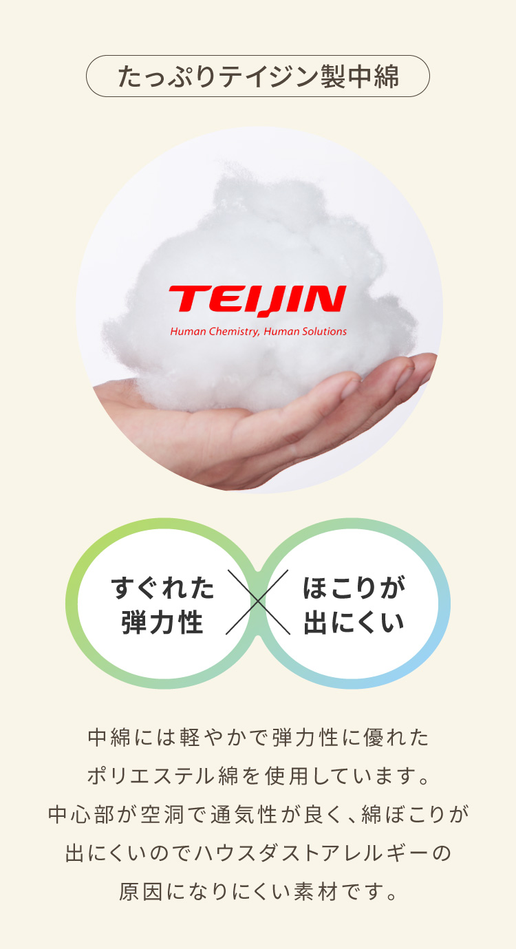 中わたには帝人クリスターを採用し、ふんわり軽くへたりにくい高機能ポリエステルわたを実現。