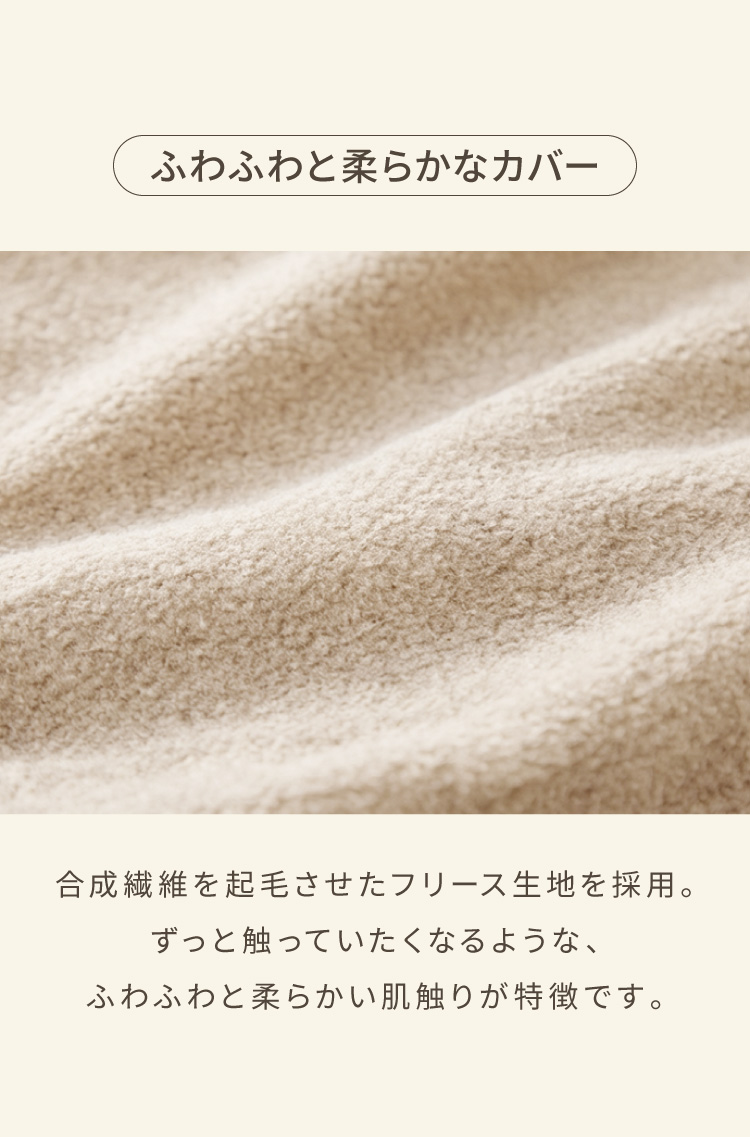 カバーにはやわらかなフリース素材を使用し、肌ざわりも心地よく、季節を問わず快適に使えます。