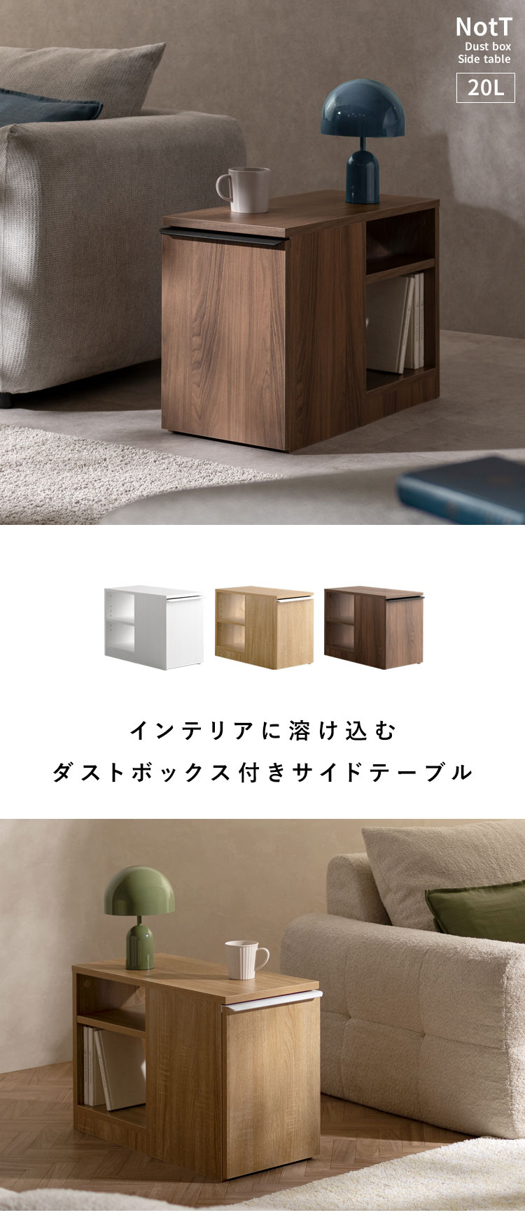リビングでのくつろぎを快適にお過ごしいただけるダストボックス付きサイドテーブル『NotT(ノット)』。