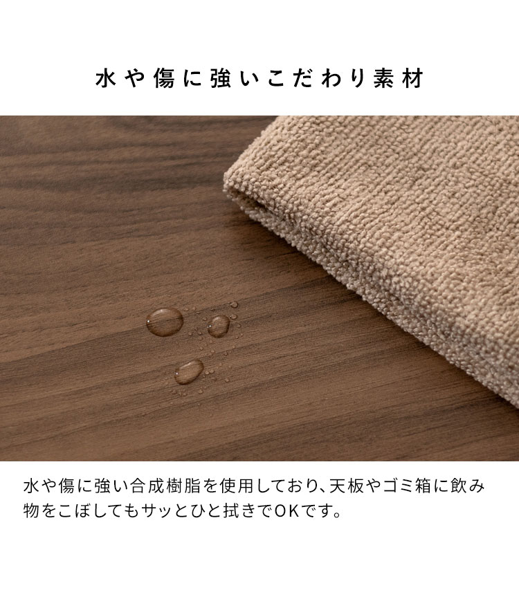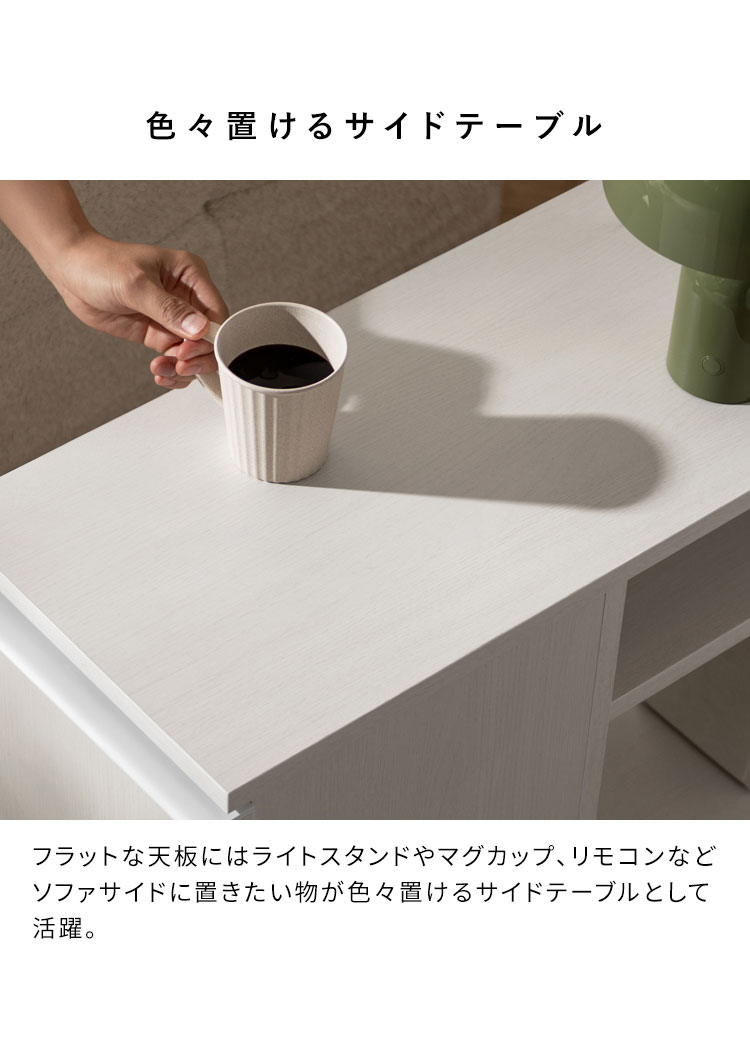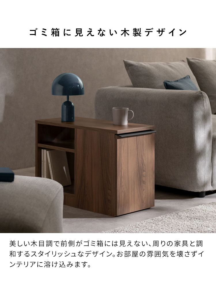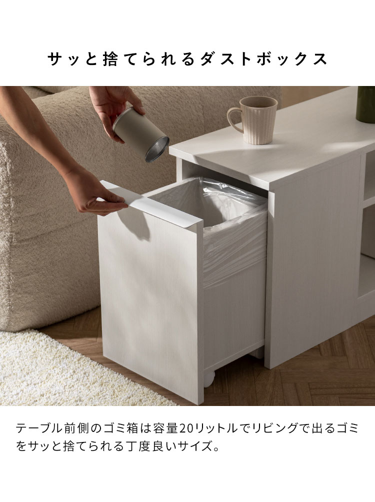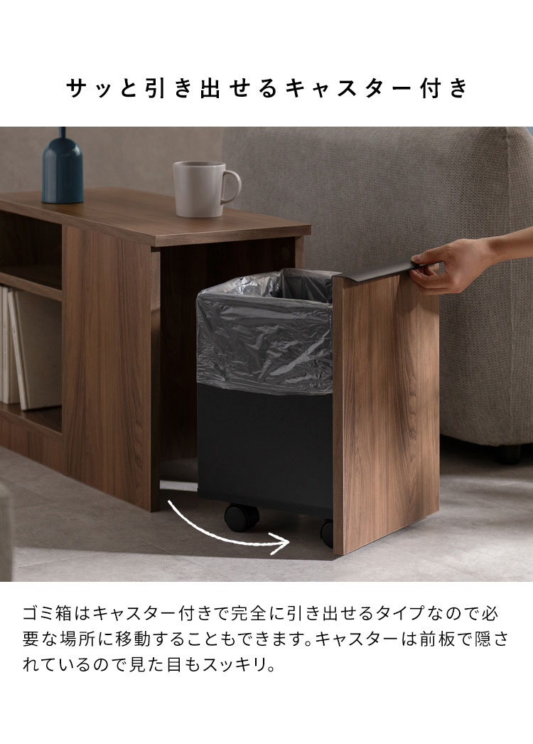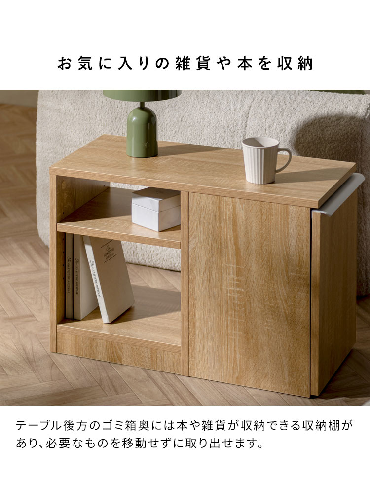 ソファの横でマグカップやリモコンを置ける天板、本や雑貨を収納できる収納棚、リビングで出たゴミをサッと捨てられるゴミ箱が一つになった便利なアイテムです。