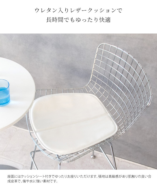 スチールのワイヤーが網目状に構成された背もたれは軽量かつ耐久性に優れております。広々とした座面はレザークッション付きでお尻が痛くなりにくく、くつろげるデザインです。座面高70cmとカウンターやバーテーブルに最適。