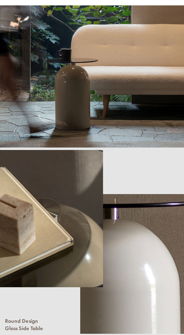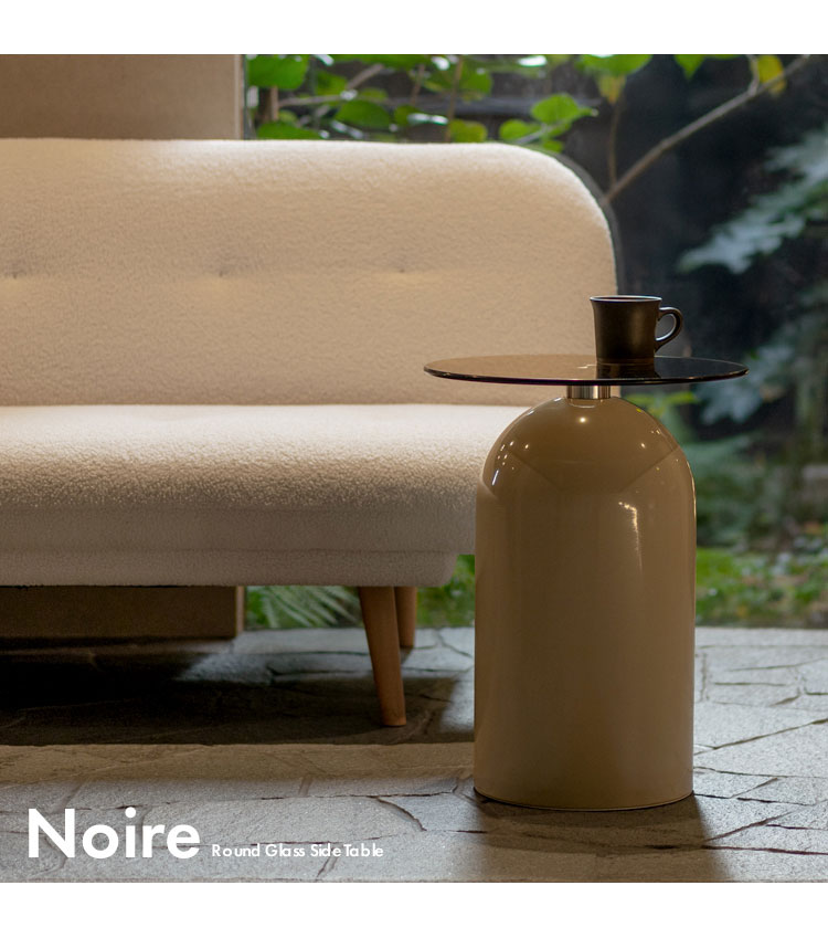 映り込みが美しいガラス天板とドーム型の円筒ベースが目を惹くサイドテーブル『Noire(ノワレ)』。