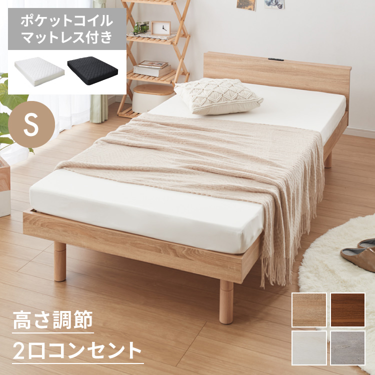 マットレス付き ベッド すのこベッド シングル ベッドフレーム 宮付き 宮棚 ポケットコイル 棚付き ヘッドボード 2口コンセント付き メラミン