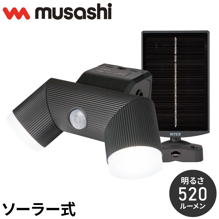 ムサシ 人感センサーライト ソーラー式 屋外 防犯ライト 4.5W×2灯 LEDソーラーセンサーライト S-CY60 自動点灯 人感センサー 強盗対策 防犯灯 代引不可
