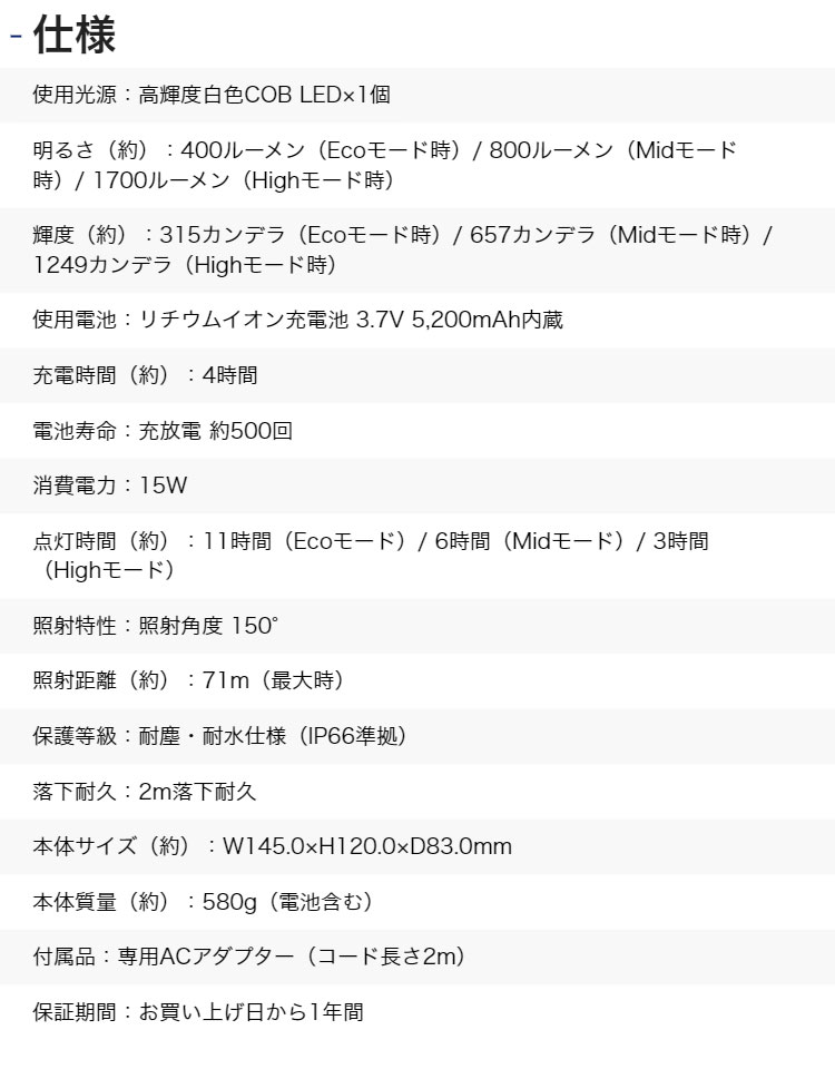 明るさ(約):400ルーメン(Ecoモード時)/ 800ルーメン(Midモード時)/ 1700ルーメン(Highモード時)