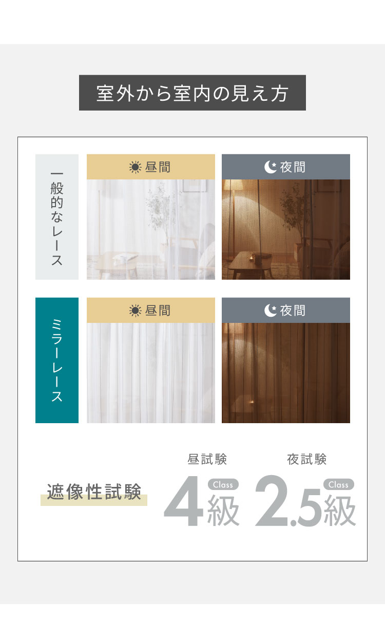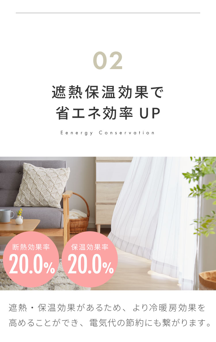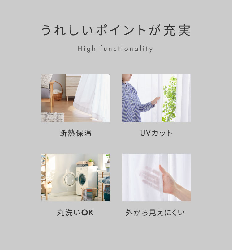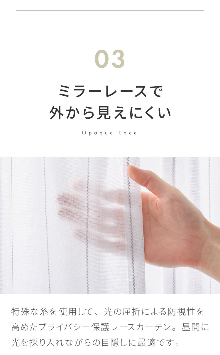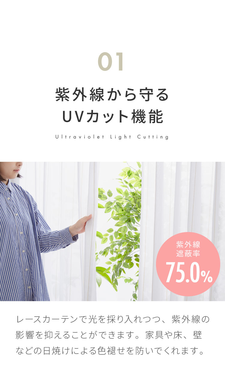 UVカット75%のレースカーテンで光を取り入れつつ気になる紫外線をカットできます。お肌や家具、フローリングを日焼けから守ってくれます。ミラー加工の効果で光の反射によって日中外から室内が見えにくく、プライバシーを確保できます。外からの視線が気になる方におすすめです!省エネ効果もあり夏の時期の窓から伝わる熱を遮断 断熱効果率20%以上。冬の時期の窓から伝わる寒さを遮断 保温効果率20%以上。アジャスターフック(Aフック)が付属されております。洗濯機での洗濯可能なのでお手入れも簡単です!※商品写真はできる限り実物の色に近づけるよう加工しておりますが、撮影環境やお客様のお使いのモニター設定、お部屋の照明等により実際の商品と色味が異なる場合がございます。 ご了承ください。