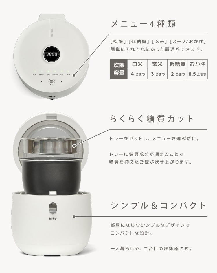 ●炊飯容量:1〜4合(白米4合まで、玄米3合まで、低糖質2合まで、おかゆ0.5合まで)