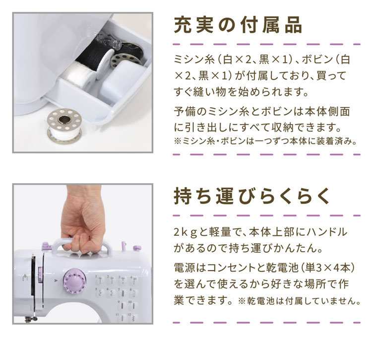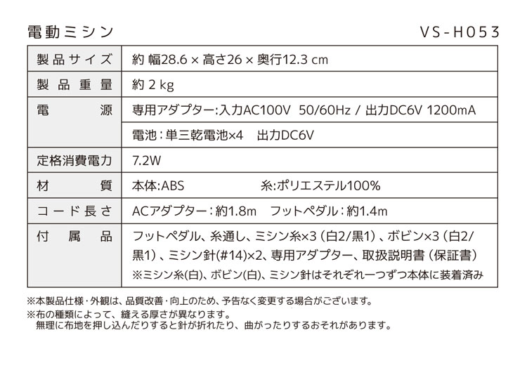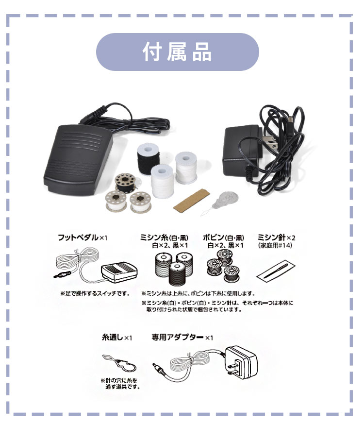 ●付属品:フットペダル、糸通し、ミシン糸×3(白2/黒1)、ボビン×3(白2/黒1)、ミシン針(#14)×2、専用アダプター、取扱説明書(保証書)※ミシン糸(白)、ミシン針はそれぞれ一つずつ本体に装着済み