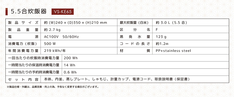 ●セット内容:本体、内釜、蒸しプレート、しゃもじ、計量カップ、電源コード、取扱説明書(保証書)