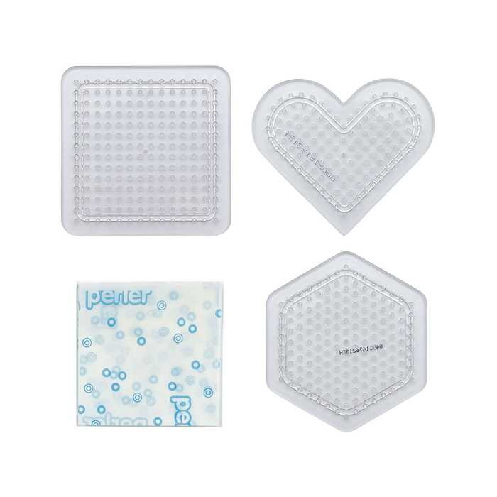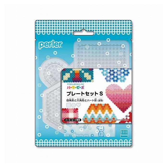 パーラービーズ専用のプレートセットがリニューアル!●透明プレートにぴったりの爽やかなデザインに、創作意欲を刺激する色とりどりの作品をレイアウトしたラベルがポイント。●パッケージをブリスターからプラスチック袋に変えることで、パッケージサイズをスリム化し梱包材を削減。●図案シートに重ねて使える透明プレートは、子どもから大人まで幅広い年齢の方にお手軽にお楽しみいただけます。【セット内容】プレートS 四角形(透明) ×1、プレートS 六角形(透明) ×1、プレートS ハート形(透明) ×1、アイロンペーパー×1