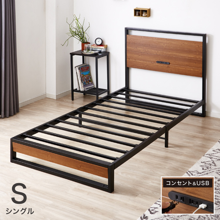 ・木目調とスチールフレームがおしゃれな宮付きベッドフレーム