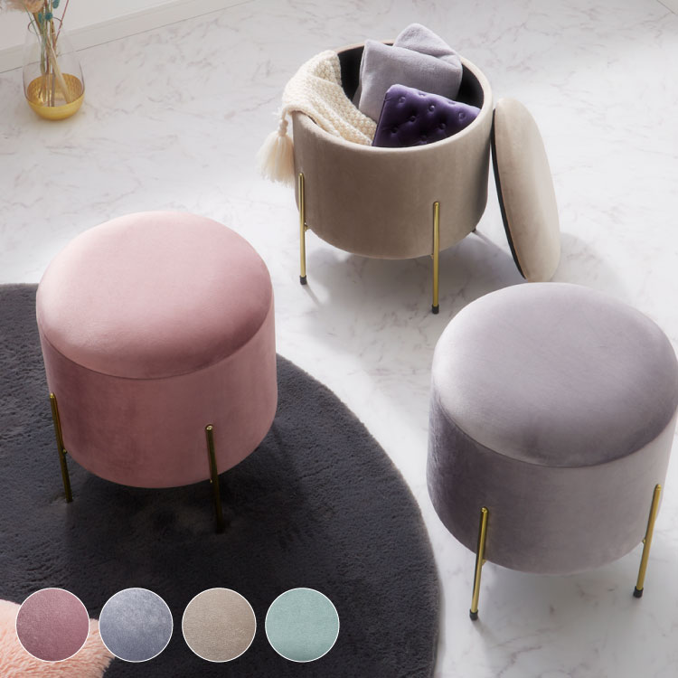 ベルベット生地を使用した脚付き収納スツール 丸型