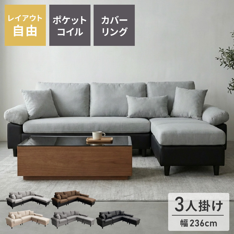 カバーリング ソファ 3人掛け 洗える 幅236 L字型 クッション オットマン コーナーソファ ポケットコイル 天然木 大きめ おしゃれ 北欧 レザー 代引不可