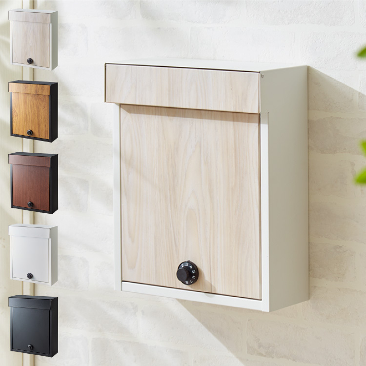 郵便ポスト、ダイヤル式、壁掛け、壁付け、スチール製、角2対応、A4対応、大容量、省スペース、スチール製、軽量、サビにくい、木目調、おしゃれ、北欧、鍵付き、セキュリティ、壁掛けポスト、メールボックス、POST、ナチュラル×ホワイト、ブラウン×ブラック、キャメル×ブラック、ブラック、ホワイト
