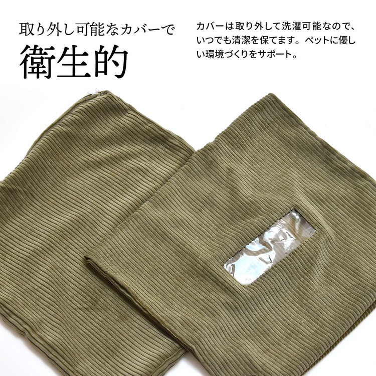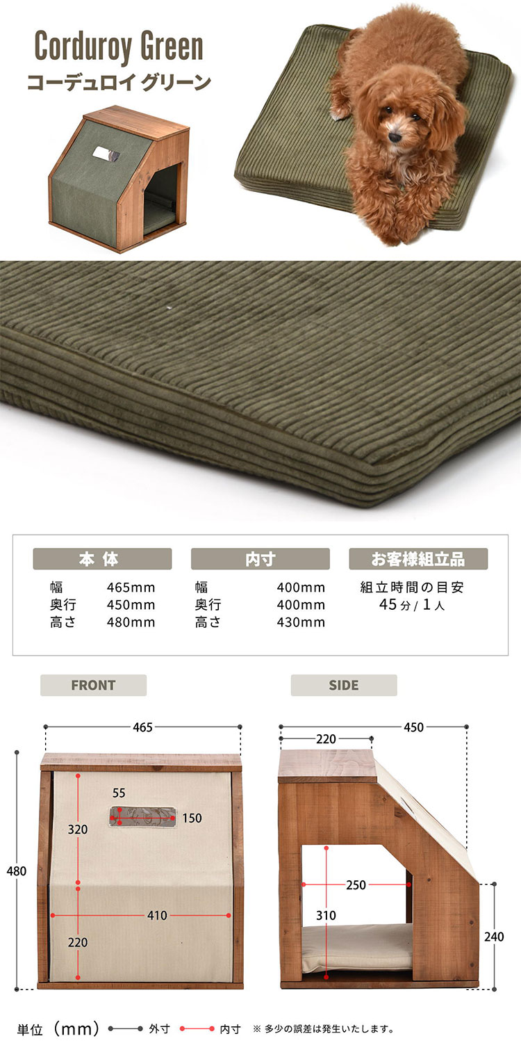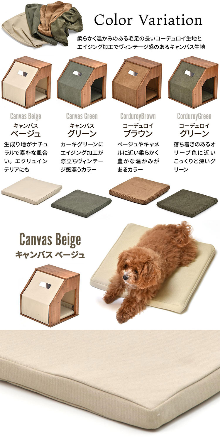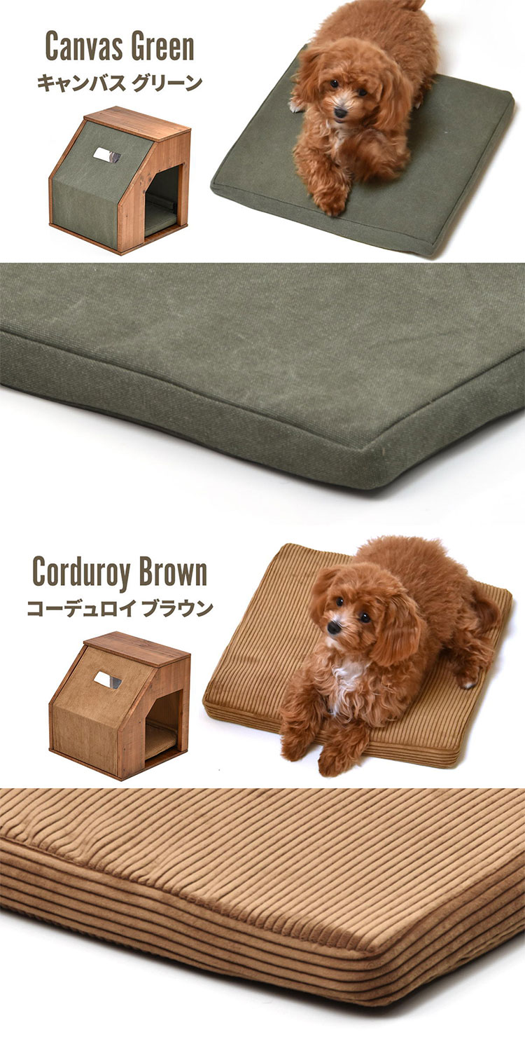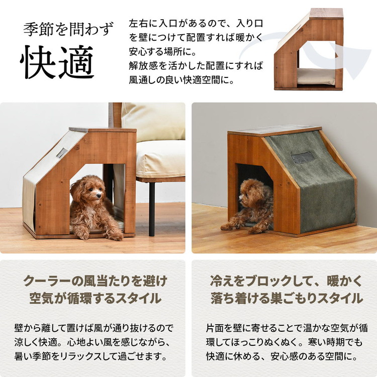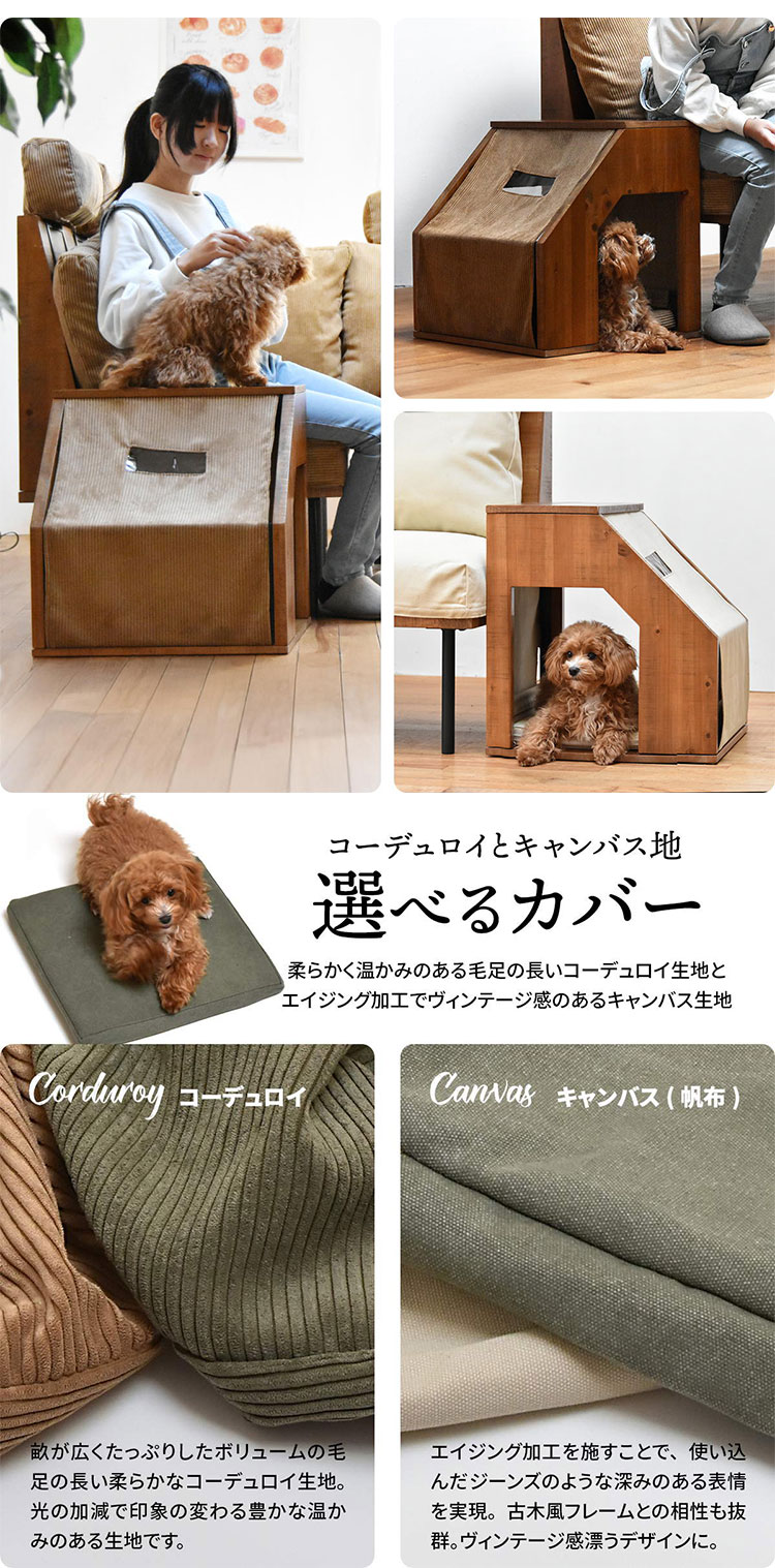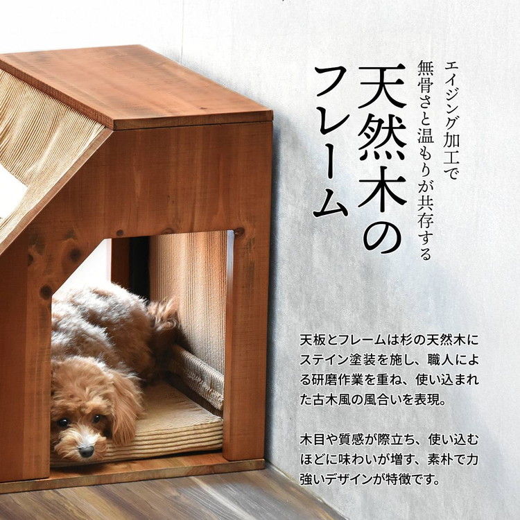 ■古材の様なエイジング加工を施した天然木をふんだんに使いブルックリンスタイルに仕上げたインフィニティーシリーズのペットハウス。ソファーと同じパターンの生地の種類から選択ができるのでソファーと合わせると統一感も出ておしゃれです。また天板部分は平らに設計されておりソファー横に置いてサイドテーブル兼ペットハウスという活用の仕方もできます。透明な小窓もついておりペットの寝顔も覗けて可愛いです。