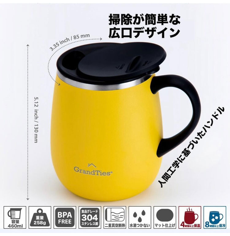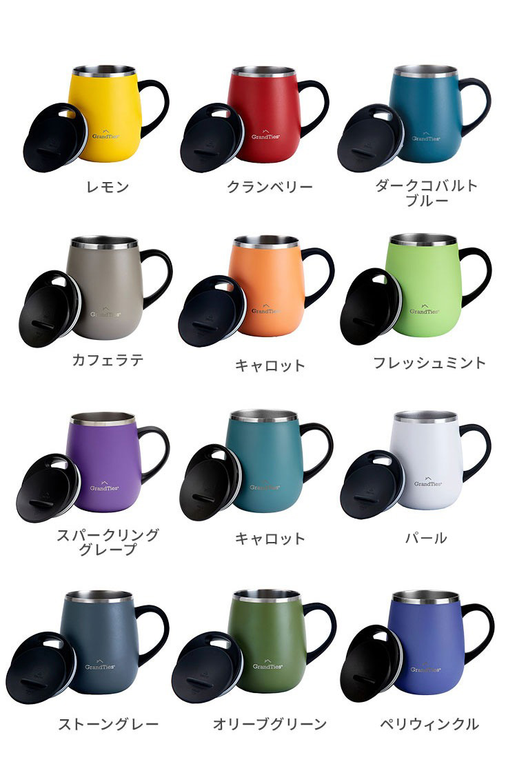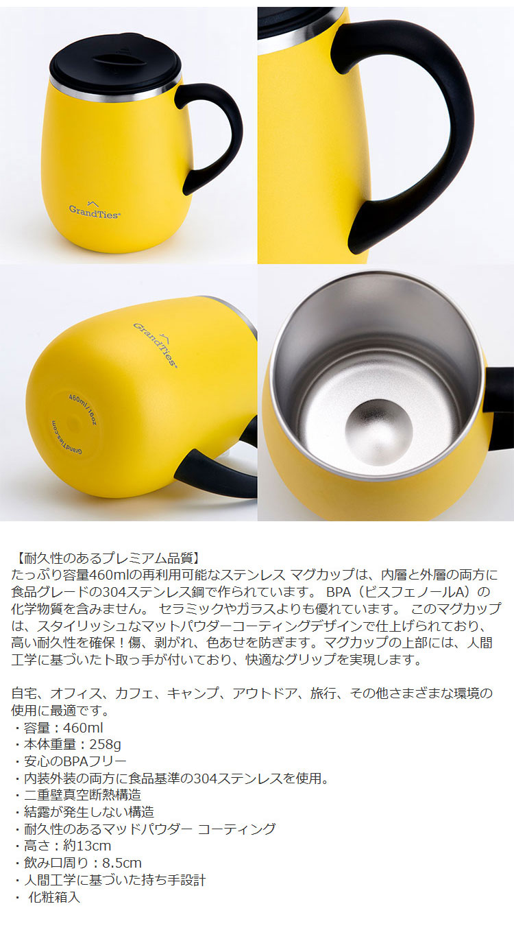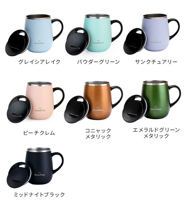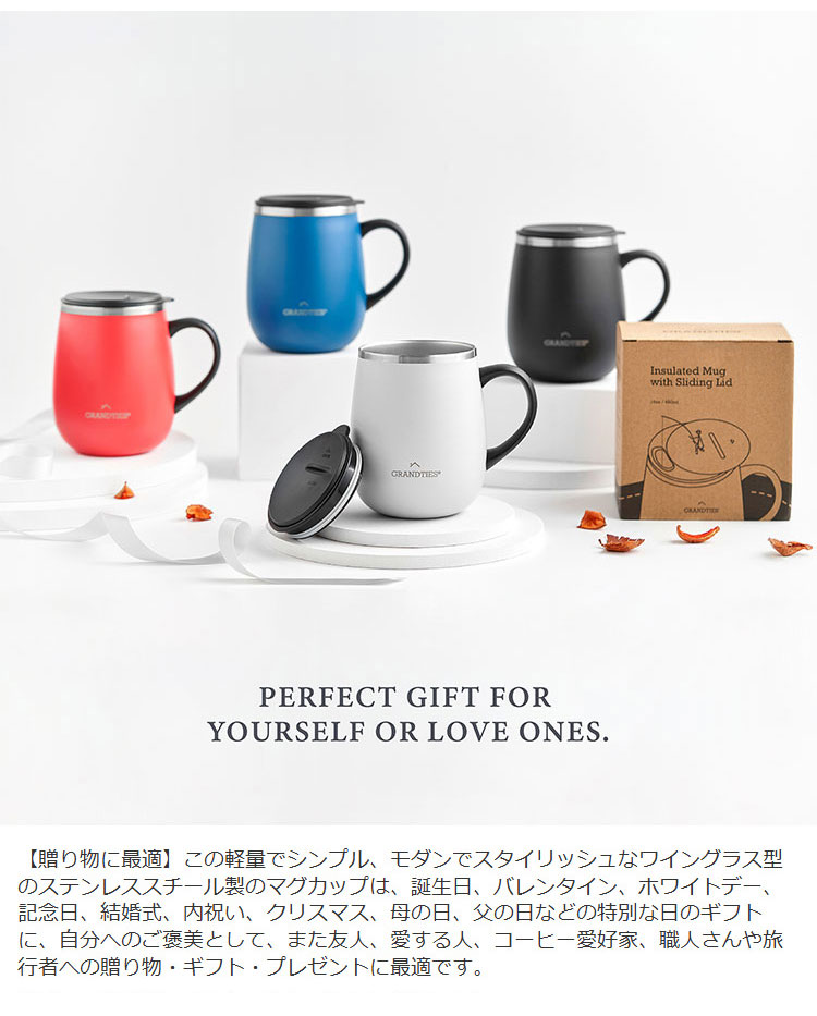 GRANDTIES グランタイズ 全19色 プレミアム真空断熱マグカップ 460ml 簡単開閉スライド蓋付き ステンレス製 二重壁真空断熱構造 保温・保冷機能付き