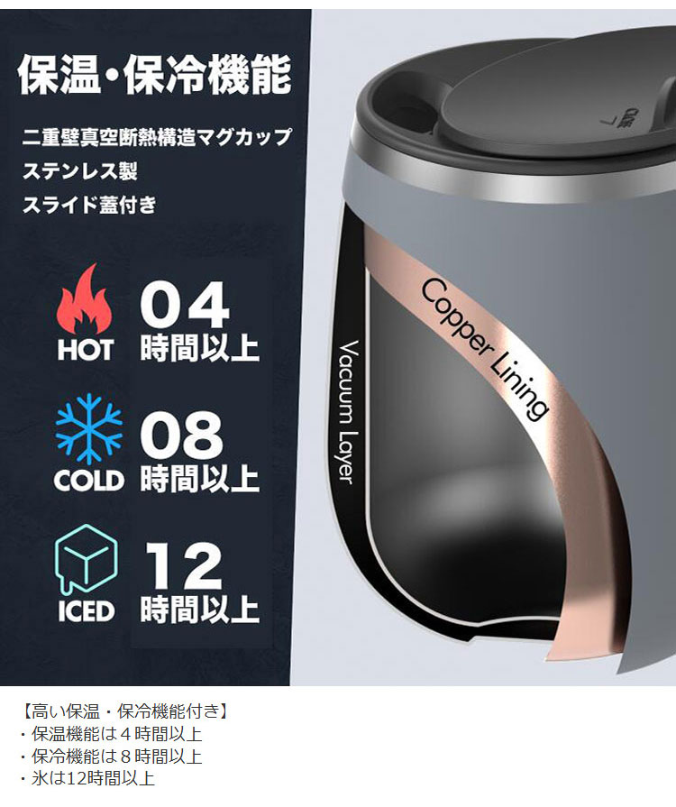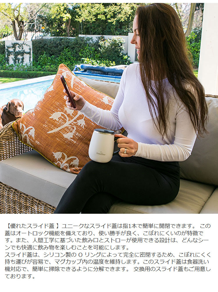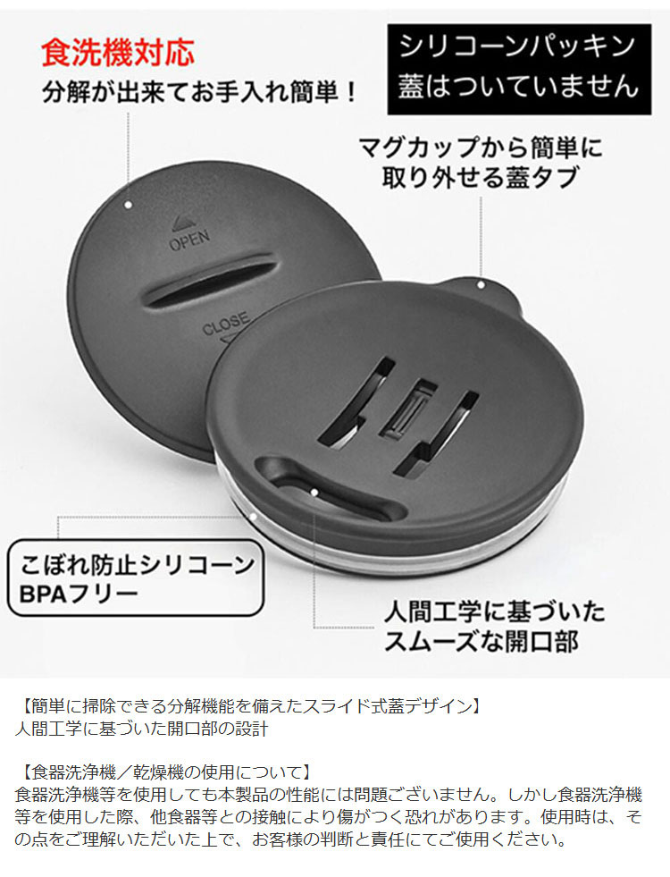 【優れたスライド蓋 】ユニークなスライド蓋は指1本で簡単に開閉できます。 スライド蓋は、シリコン製の O リングによって密閉するため、こぼれにくく持ち運びが容易で、マグカップ内の温度を維持します。このスライド蓋は食器洗い機対応で、簡単に掃除できるように分解できます。 交換用のスライド蓋もご用意しております。