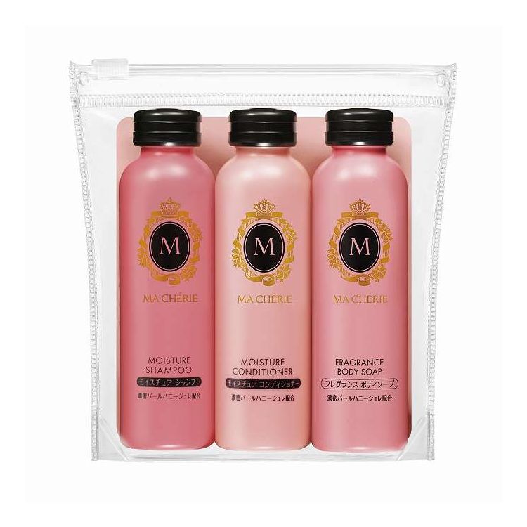 心地よい香りと、うるおいつや肌の毎日を。ボディソープ、モイスチュアシャンプー・コンディショナーのトラベルセット。フレグランス ボディソープ f 50mL、モイスチュア シャンプー EX f 50mL、モイスチュア コンディショナー EX f 50mL、うっとり甘くさわやかなフローラルフルーティの香り