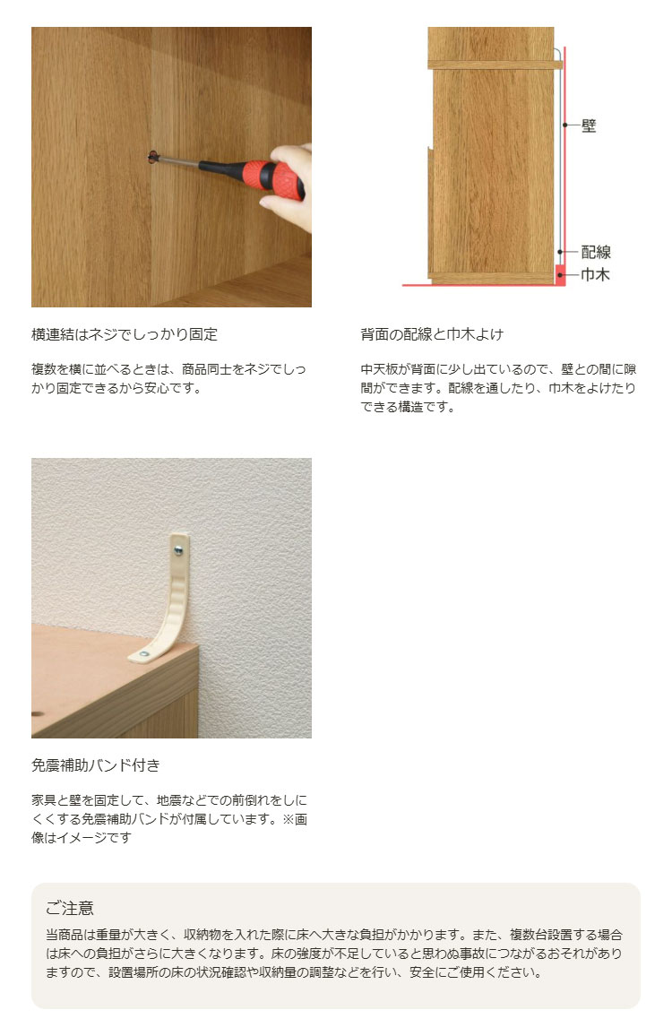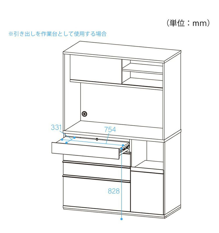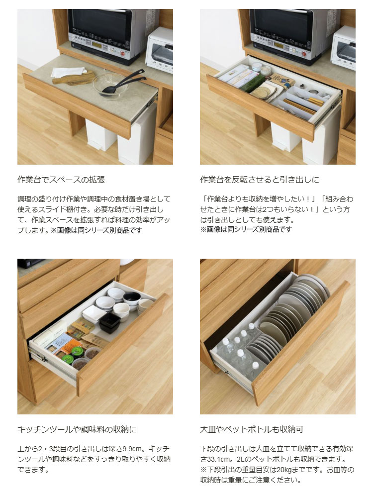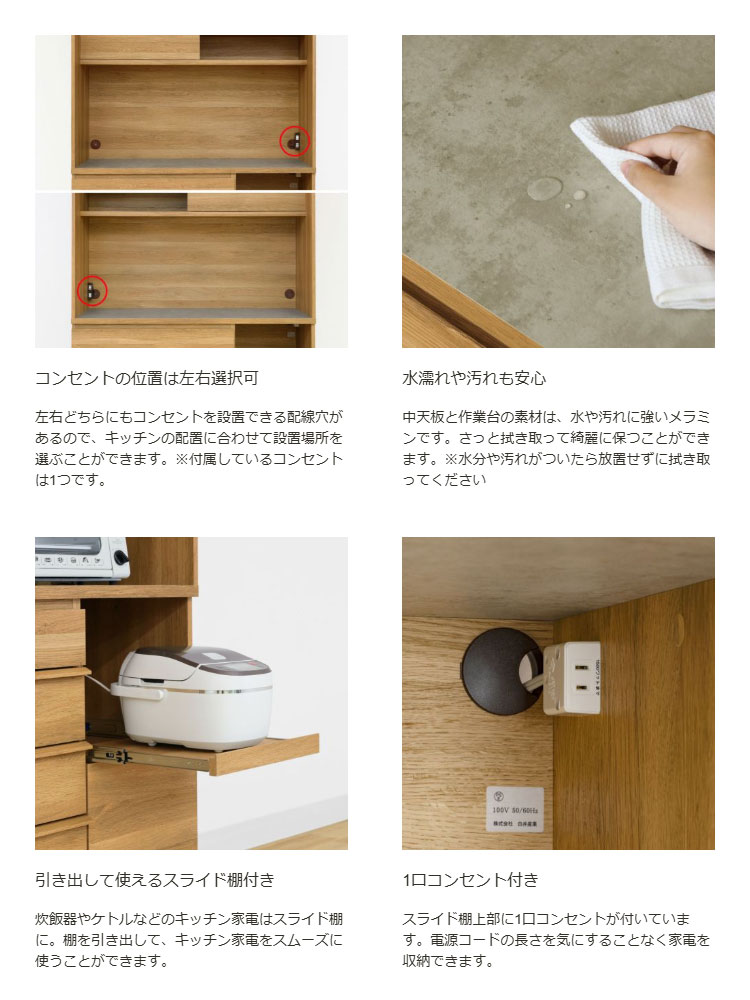 素材・加工:【本体素材】中天板、引出底板(作業台)/合成樹脂化粧繊維板(メラミン)、他/プリント紙化粧繊維板【表面素材】プリント紙化粧繊維板