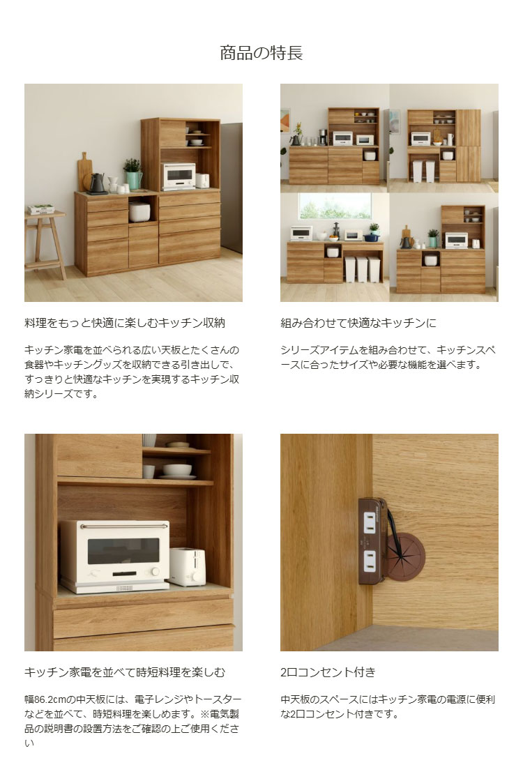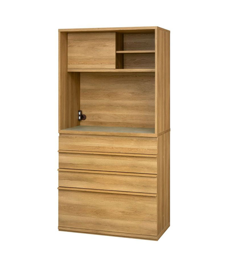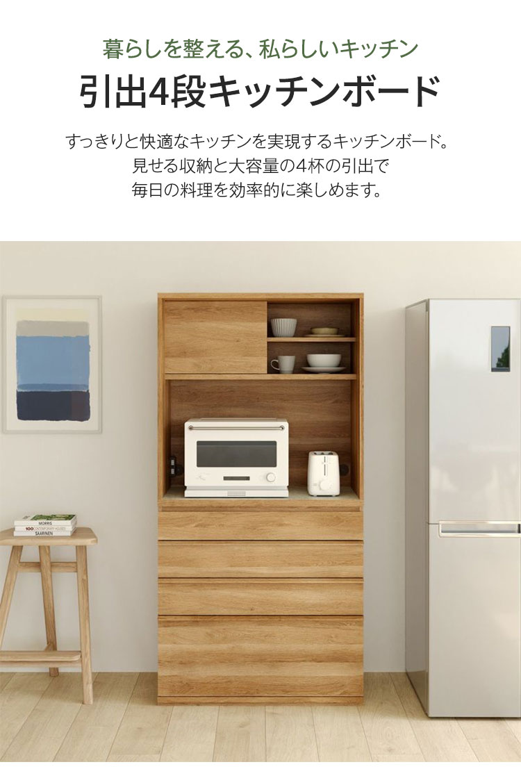 キッチンボード 食器棚 レンジ台 幅90cm 高さ180cm ナチュラルブラウン 引出4段 コンセント付 メラミン天板 キッチン 家電 収納 コモピア 代引不可