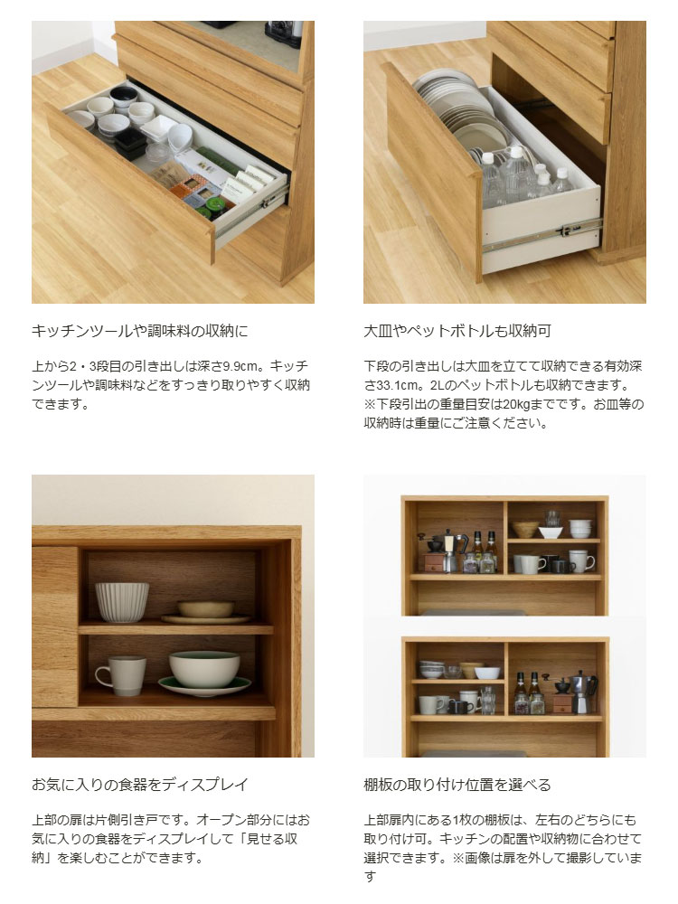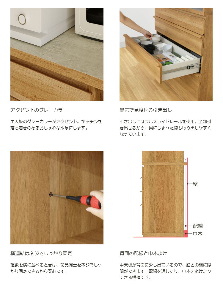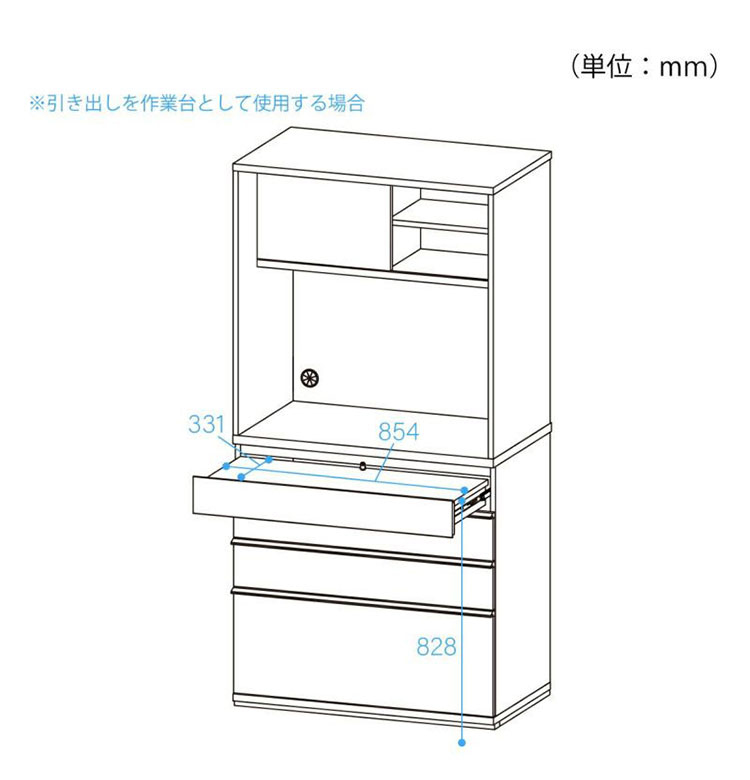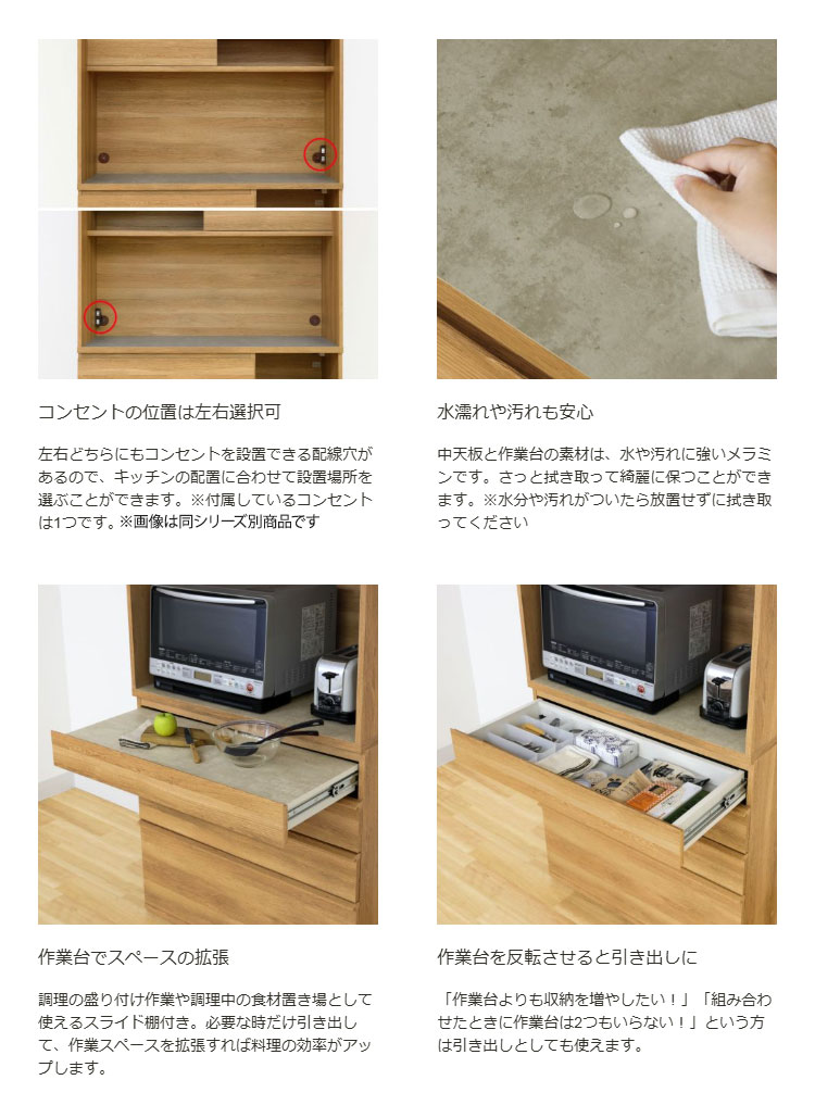 素材・加工:【本体素材】中天板、引出底板(作業台)/合成樹脂化粧繊維板(メラミン)、その他/プリント紙化粧繊維板【表面素材】プリント紙化粧繊維板