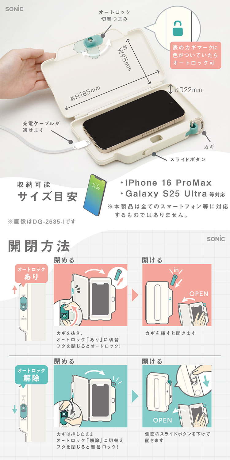 ・【オートロックあり時】スマホを入れて、フタを閉じると即ロック!カギを使ってのみ開閉可能/【オートロック解除時】いつでも本体側面のスライドボタンで開閉できる。見ないように入れる、だけでも脱スマホの最初の一歩に!