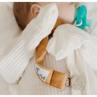 ストラップの先端に付いたループにおしゃぶりや歯固めなどを結び、もう片方の先端についたクリップをお子様のお洋服やブランケット、ベビーカーなどに留めて使います。
