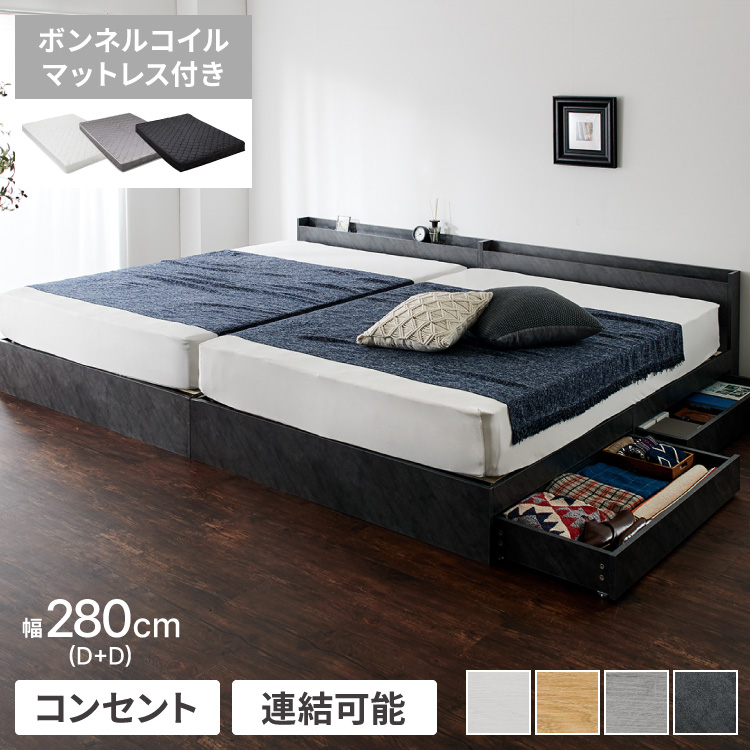 ファミリーベッド 収納ベッド ワイドキング280 D+D ボンネルコイルマットレス付き ベッド 収納付き ベッドフレーム 2口コンセント付き 連結ベッド 代引不可