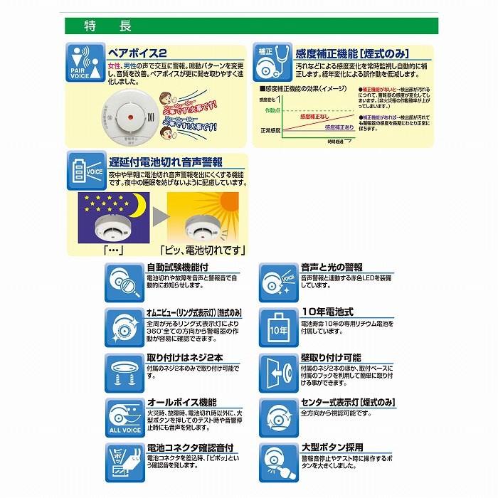 熱感知式の住宅用火災警報器。女性、男性の声で交互に警報。鳴動パターンを変更し、ペアボイスが更に聞き取りやすく進化しました。夜中や早朝に電池切れ音声警報を出にくくする機能で夜中の睡眠を妨げないように配慮しています。※ご使用にあたっては取扱説明書をよくお読み下さい