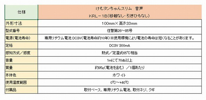 寸法 外径:100×高さ:33mm 付属品 取付ベース、専用リチウム電池、取付ネジ、クギ 質量 約95g(電池含む) 感知方式/感度→熱式/定温式65℃相当 使用環境:0℃〜+40℃ 型式番号:住警第26〜85号 音量:1mにて70db以上