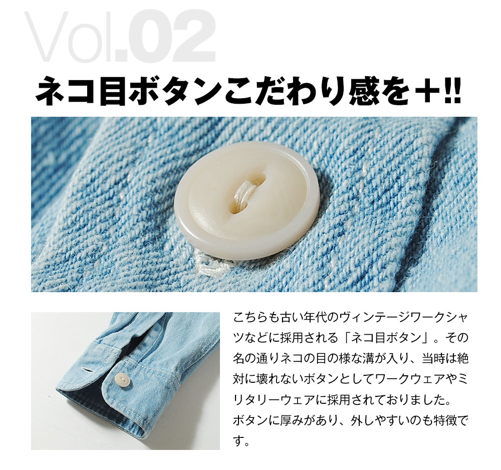 | 商品説明 | 通常シャツに使われない様なデニム生地10ozコットンデニムを使用したデニムワークシャツ。タフな素材感で長年愛用頂けるデニムシャツ。ストレートのバックヨークやエルボーパッチなど、ワークシャツとしての強度が御座います。ネコ目ボタンやフラップポケットなど、ヴィンテージのワークシャツを踏襲。シンプルなデザインで汎用性が効きます。少しゆったり目のサイジングがトレンド感を感じさせます。 |