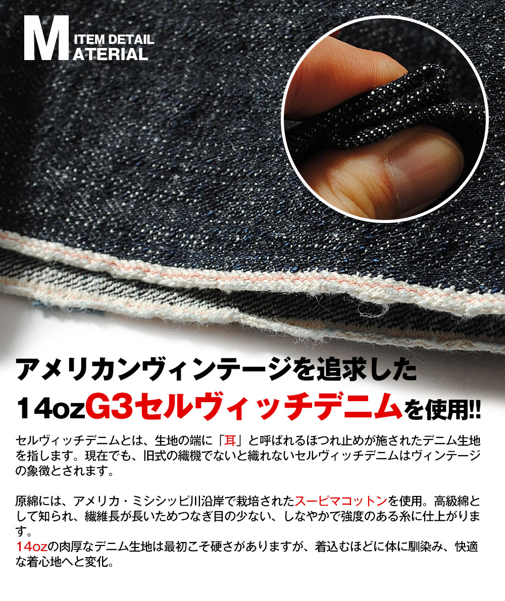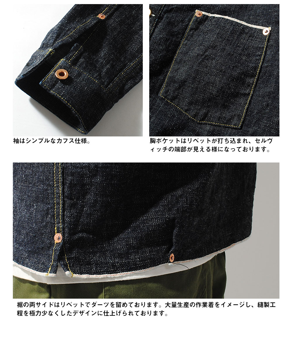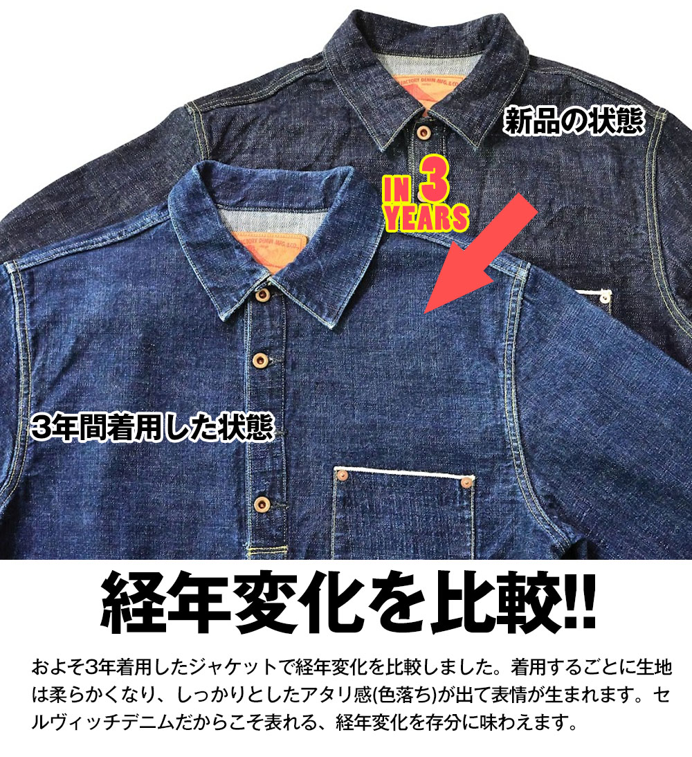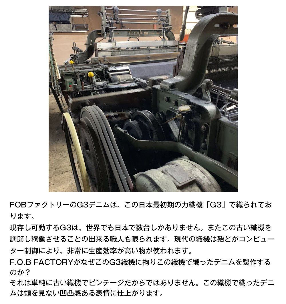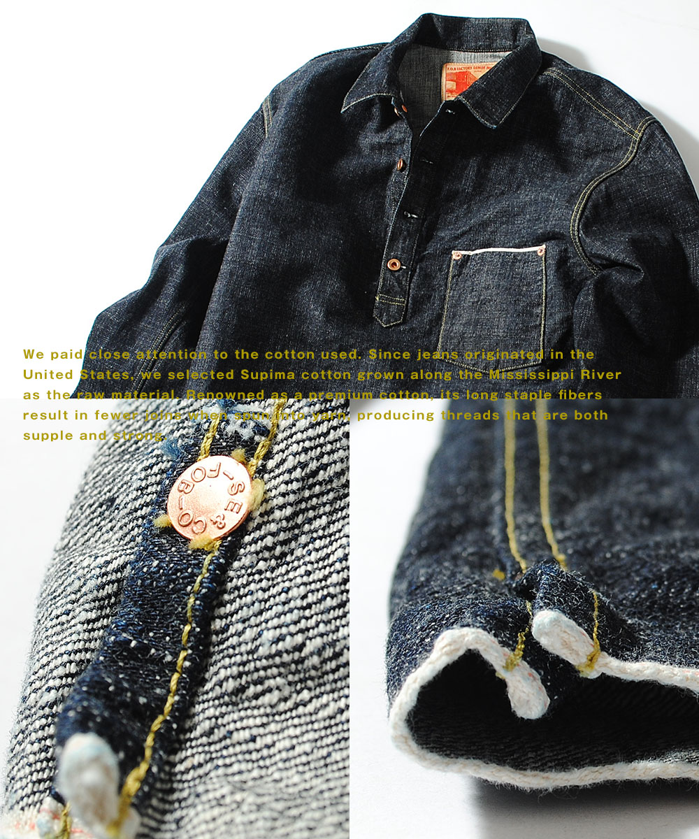 | 商品説明 | 日本最初期の力織機、豊田自動織機"G3"を使って織り上げられた、 幻の力織機と呼ばれるG3型織機は、日本で使用されている最も古い織機で、現存するものは数台しかなく、 このG3型織機にしか生まれない独特の表情に惚れ込み、苦心の末甦らせることに成功。 1900年初頭に作業着として生まれたデニムジャケットの原点をイメージしたプルオーバーデザインは、 身頃はデニムを横向きで取ることで、裾にセルヴィッチを配す仕様に仕上げられ、 流行に左右されることなく、長いシーズン定番として活躍し、色落ちやアタリなどの経年変化をお楽しみいただけ、 その素材感とシルエットの良さを是非体感してみてください。 |