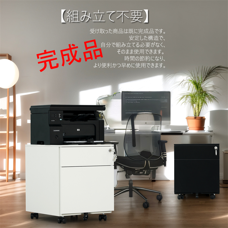 ※三つの引き出しがあります。いろものを置くことができます。静音スライドレール、第一階には便利なペンケースが一枚付いています。文具類の小物を保管できます。第三階にはA 4類の書類を置くことができます。また、仕切り板が配置されています。効率的に書類の分類ができます。第三階には中央車輪があります。