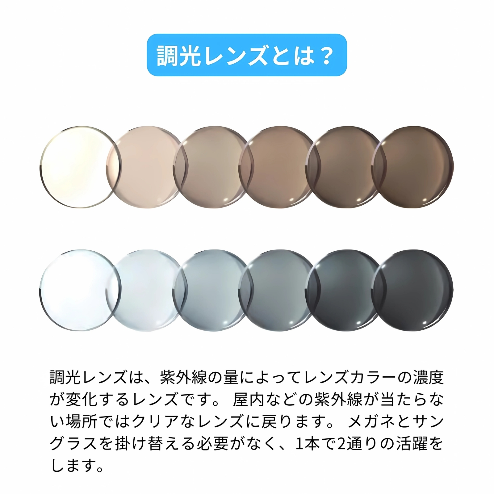 品名:ファッション用グラス / レンズの素材:プラスチック / フロントの素材:プラスチック / テンプルの素材:プラスチック / 紫外線がない状態の可視光線透過率:97% ※紫外線最大照射時はグレーは濃度75%、ブラウンは濃度60%になります。 / 紫外線透過率:1.0%以下 / 使用上の注意:高温のところに置かないでください。本商品には傷のつきにくい特殊加工を施してありますが、金属と一緒にしまうと傷がつくことがあります。あまり長い時間目にかけないでください。薄暮・夜間の運転または道路では使用しないでください。トンネルや暗いところでは使用しないでください。 / 株式会社ユーロビジョン 福井県鯖江市鳥羽町106-8-1