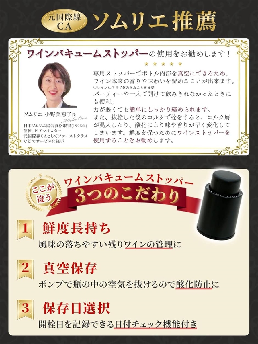「元国際線CAソムリエ 小野美恵子氏推薦」パーティーでワインを開けて残ってしまったときや、一人でワインを開けて飲みきれなかった時などに便利です。