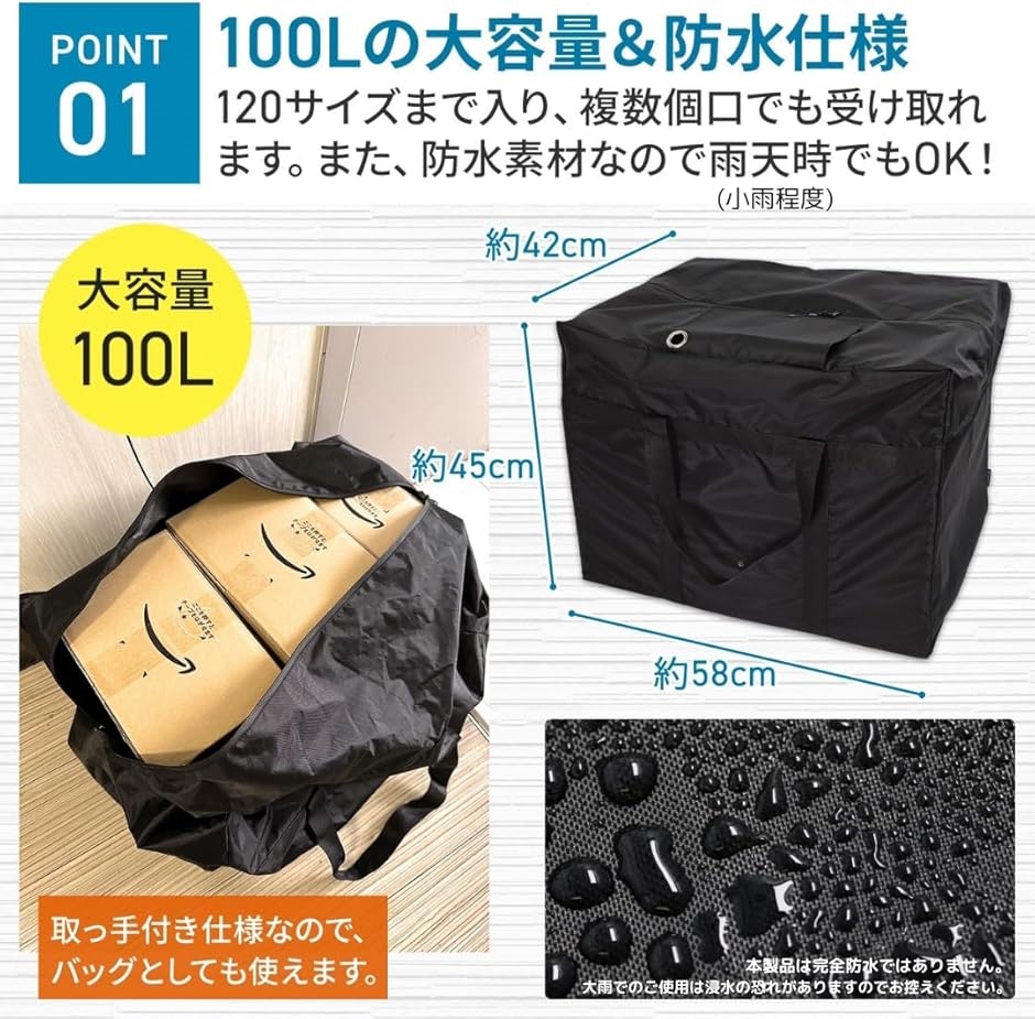 「100Lの大容量&防水仕様」 120サイズの荷物まで入る大容量サイズなので複数個口でも受け取り可能。