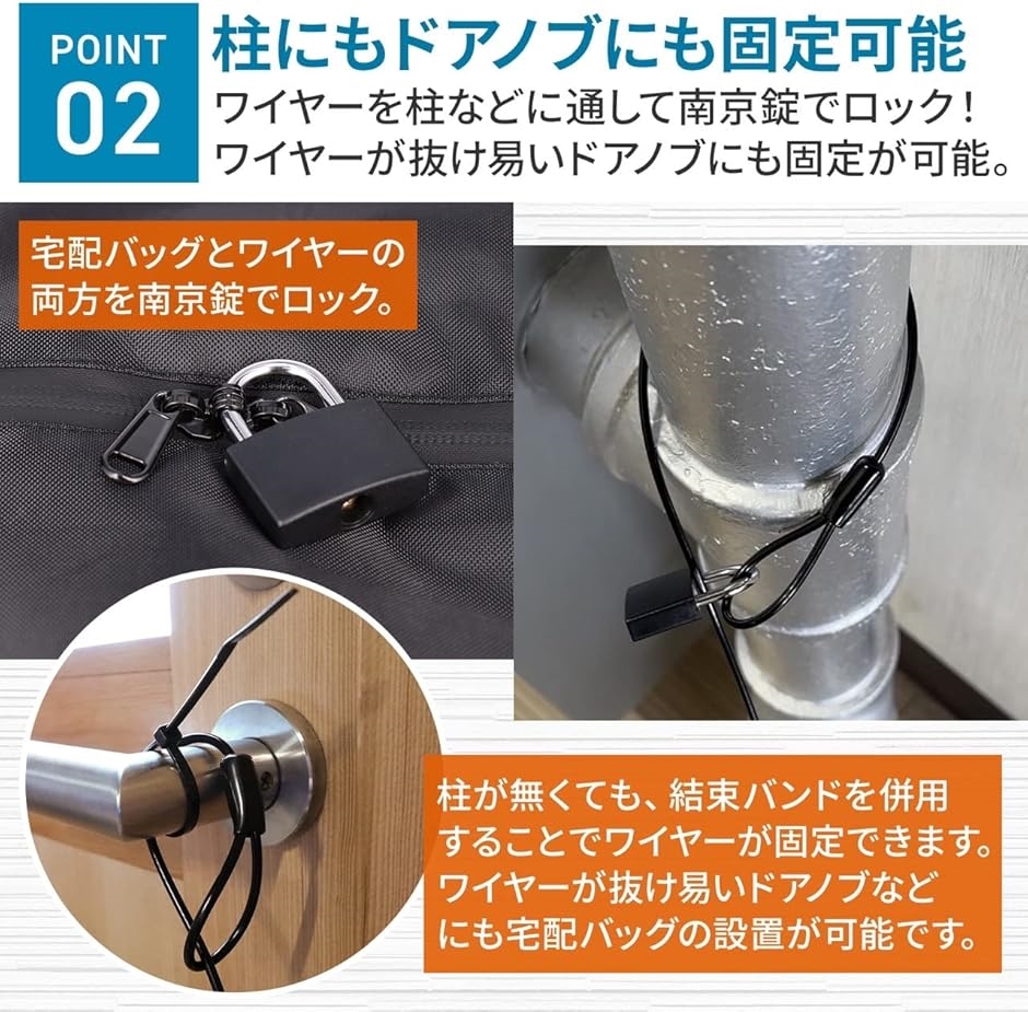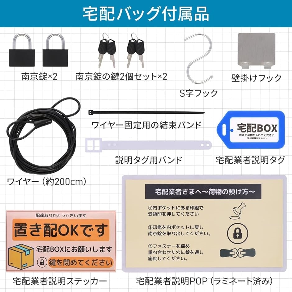 「充実の内容品」 (1) 宅配バッグ本体 (2) 南京錠x2セット (3) 固定ワイヤー200cmx1本 (4) S字フックx1個 (5) 結束バンドx1本…(固定する柱が無くドアノブ等にワイヤーを通す際ご使用ください) (6) 粘着フックx1個…(出荷時に白い保護テープが貼ってあります。