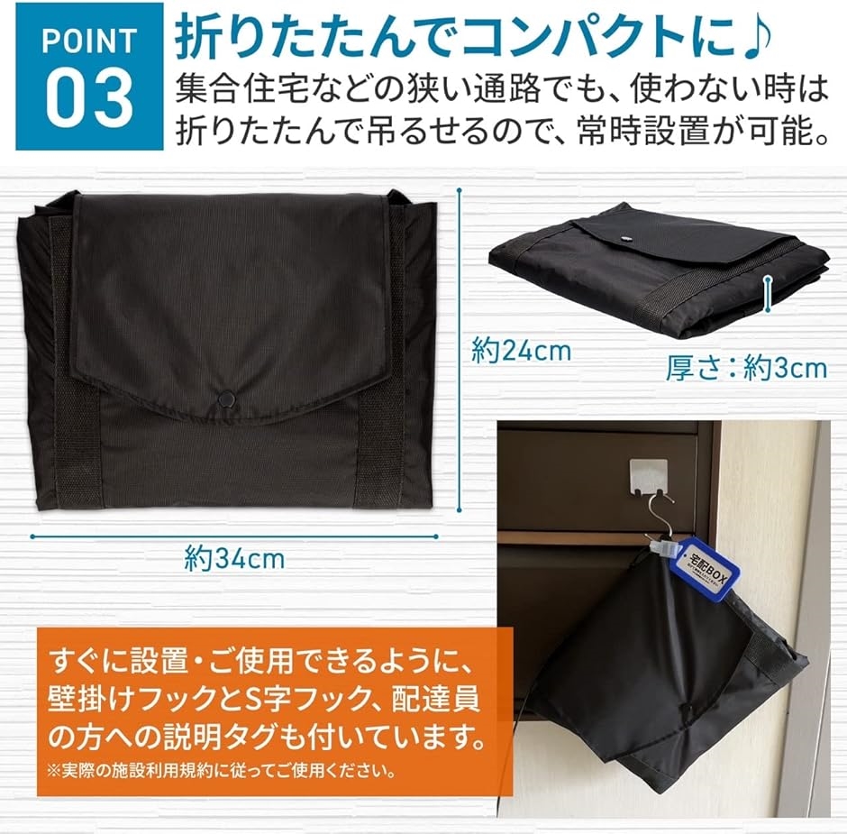 「もう再配達の手間はかかりません」こんなお悩みありませんか?「お料理中や家事や育児で宅配便を受け取るのが難しい」「好きなタイミングでゆっくりトイレ・入浴・睡眠したい」「配達が来ないと出かけられない」「置き配だとご近所に荷物や伝票など個人情報が見られてしまう」「置き配だと盗難の恐れがある」この宅配ボックスがあなたの代わりに荷物をいつでも受け取ります。共有の宅配ボックスが満杯の際でも受け取ることが出来ます。