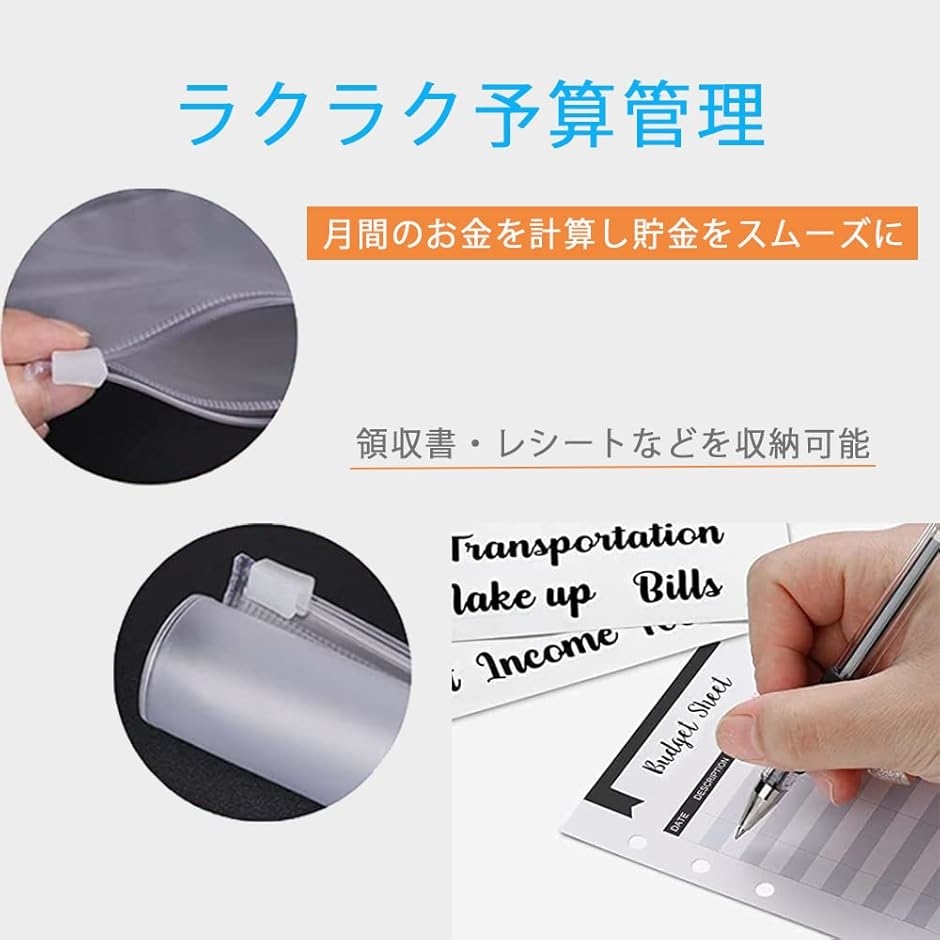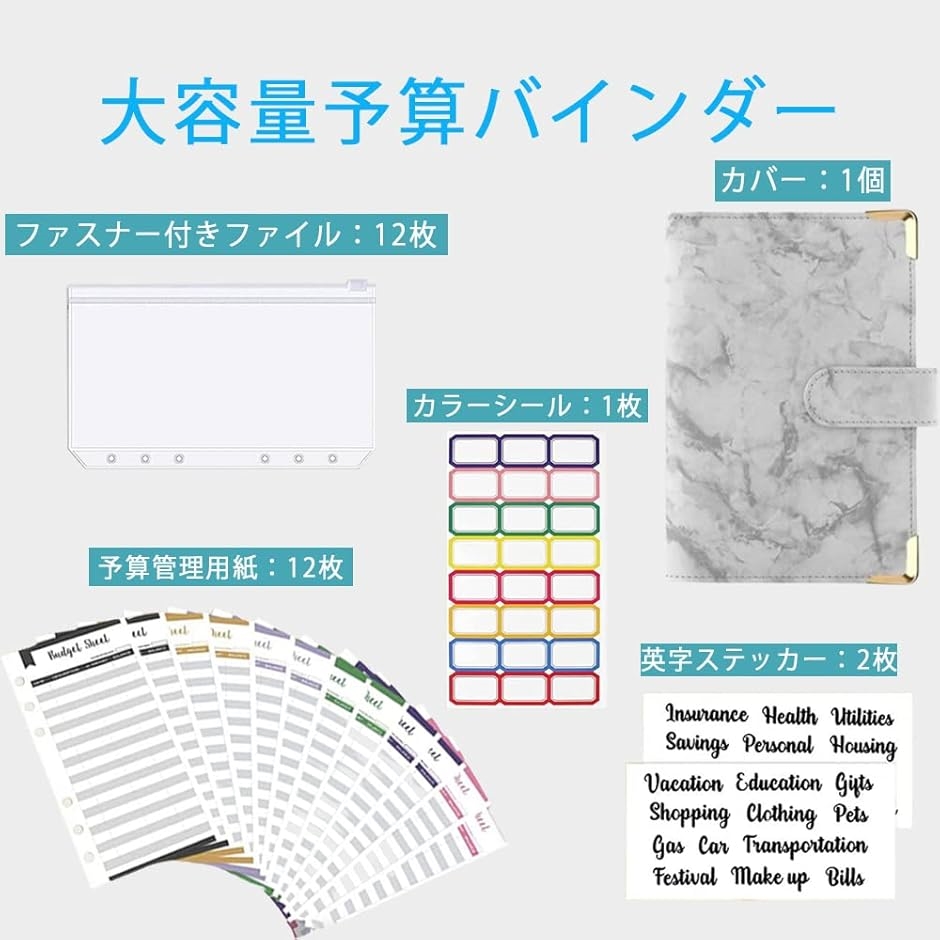 セット内容:ファスナー付きPVC素材のファイル:12枚、予算管理用紙:12枚、英字ステッカー:2枚、カラーシール:1枚の大容量予算バインダー