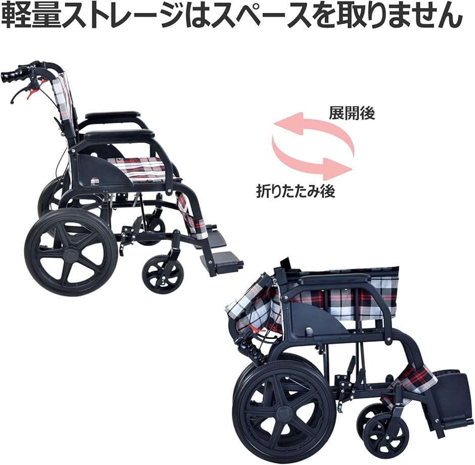 輸送用車椅子は平らに折りたため、保管や移動が簡単です。