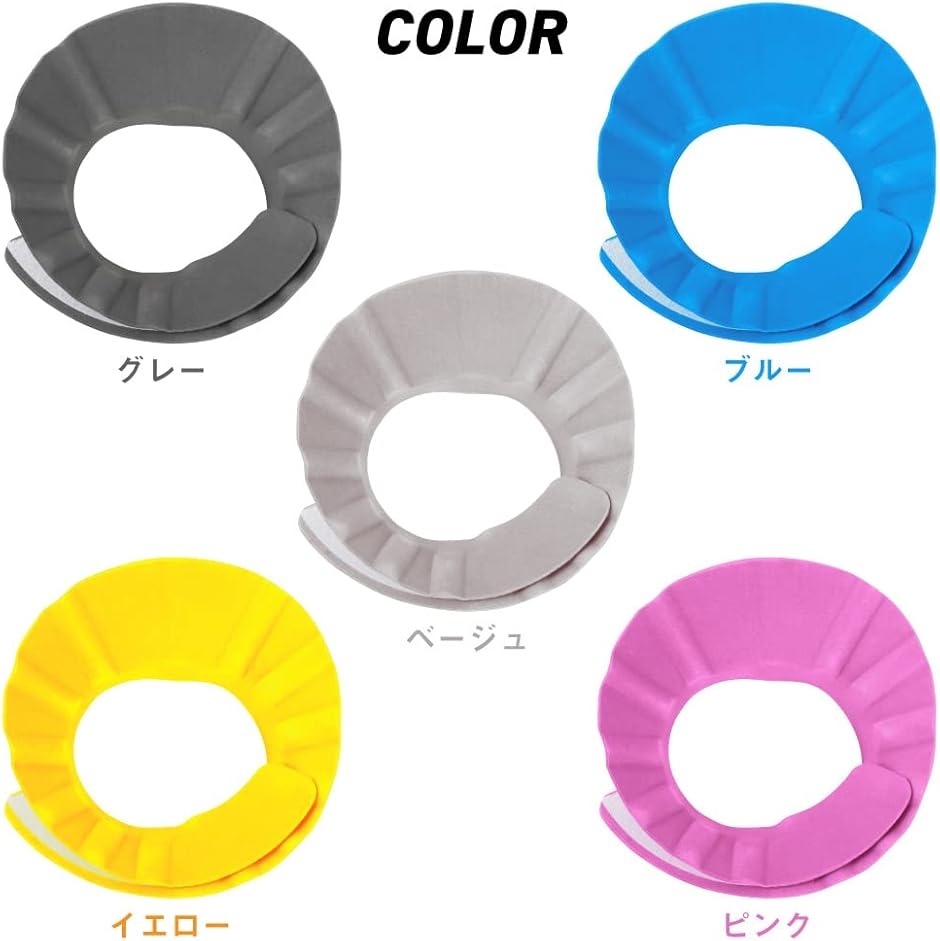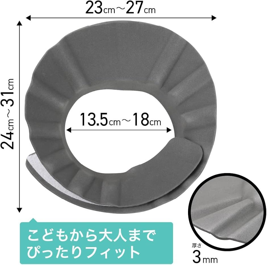 ・面ファスナーを採用したシャンプーハット・「全サイズぴったり」赤ちゃんから大人までこれ1つで全サイズぴったりフィットするシャンプーハット・「柔らか素材・超軽量」赤ちゃんの肌にも安心、介護の現場でも使用可能・「強力な面ファスナー」シャワーの水圧にも負けない、ズレを防止し、水の侵入を防ぐ仕様・「お風呂場に馴染むグレーを新色採用」カラーバリエーションは4色展開、トレンドのおしゃれなダークグレーを採用