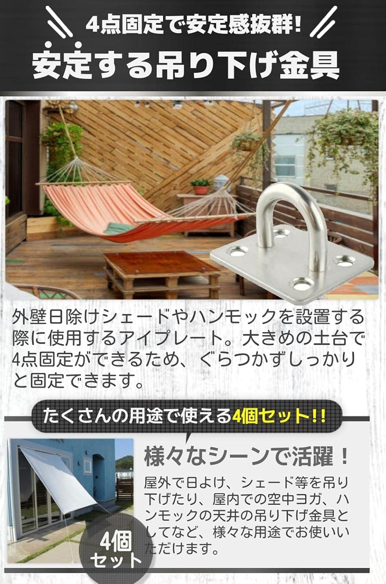 「安定する吊り下げ金具」外壁日除けシェードやハンモックを設置する際に使用するアイプレート。