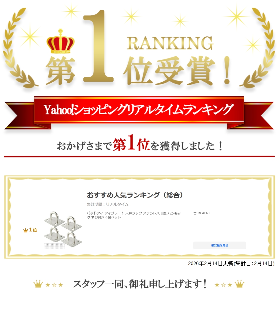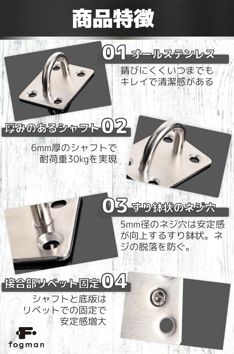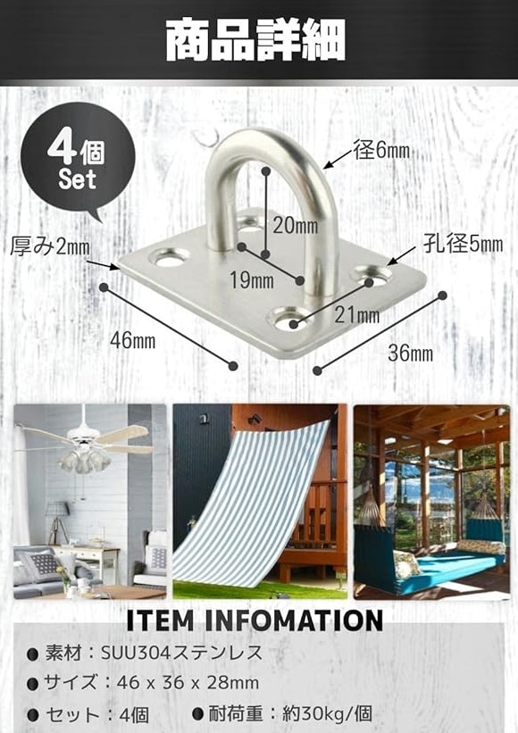 | 商品名 | パッドアイ アイプレート 天井フック ステンレス U型 ハンモック ネジ付き 4個セット |