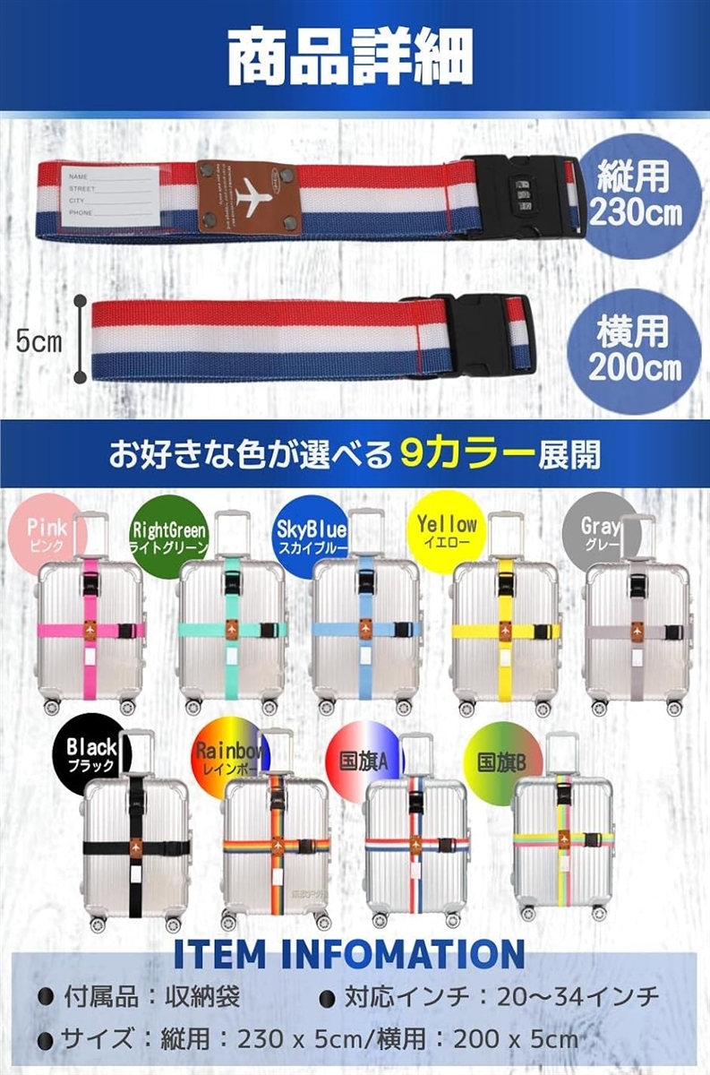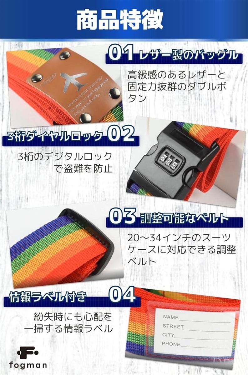 「商品特徴」レザー製のバッグル:高級感のあるレザーと固定力抜群のダブルボタン 3桁ダイヤルロック:3桁のデジタルロックで盗難を防止 調整可能なベルト:20〜34インチのスーツケースに対応できる調整ベルト 情報ラベル付き:紛失時にも心配を一掃する情報ラベル