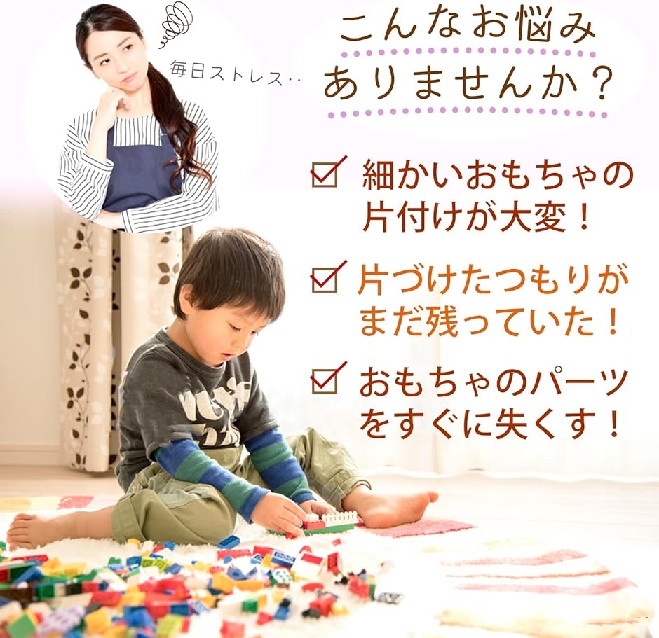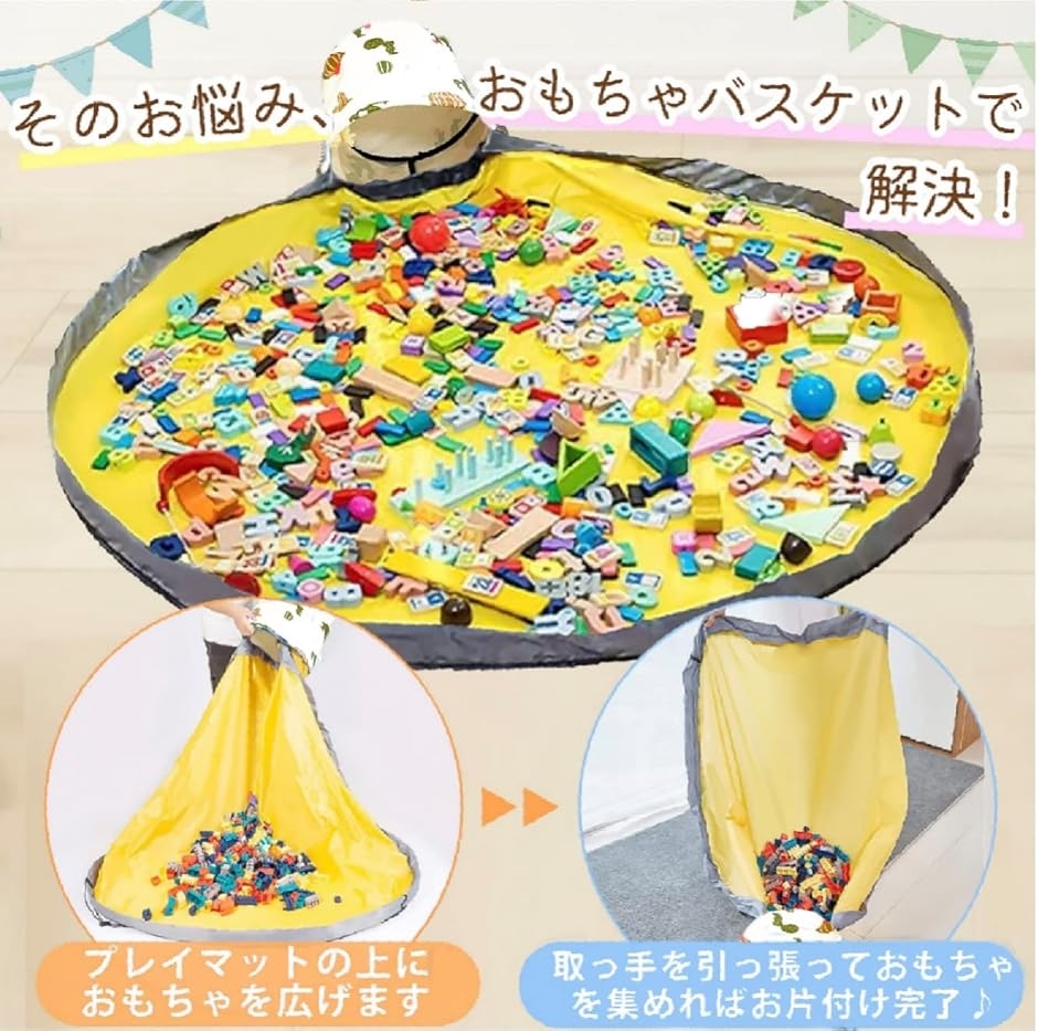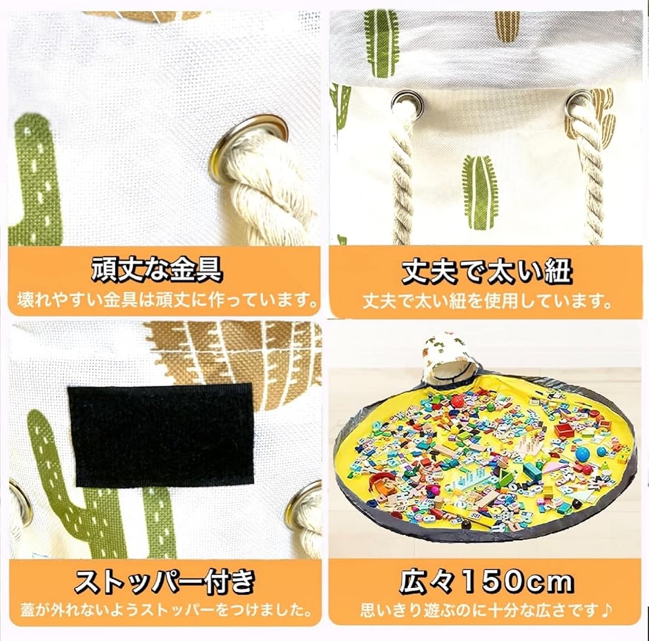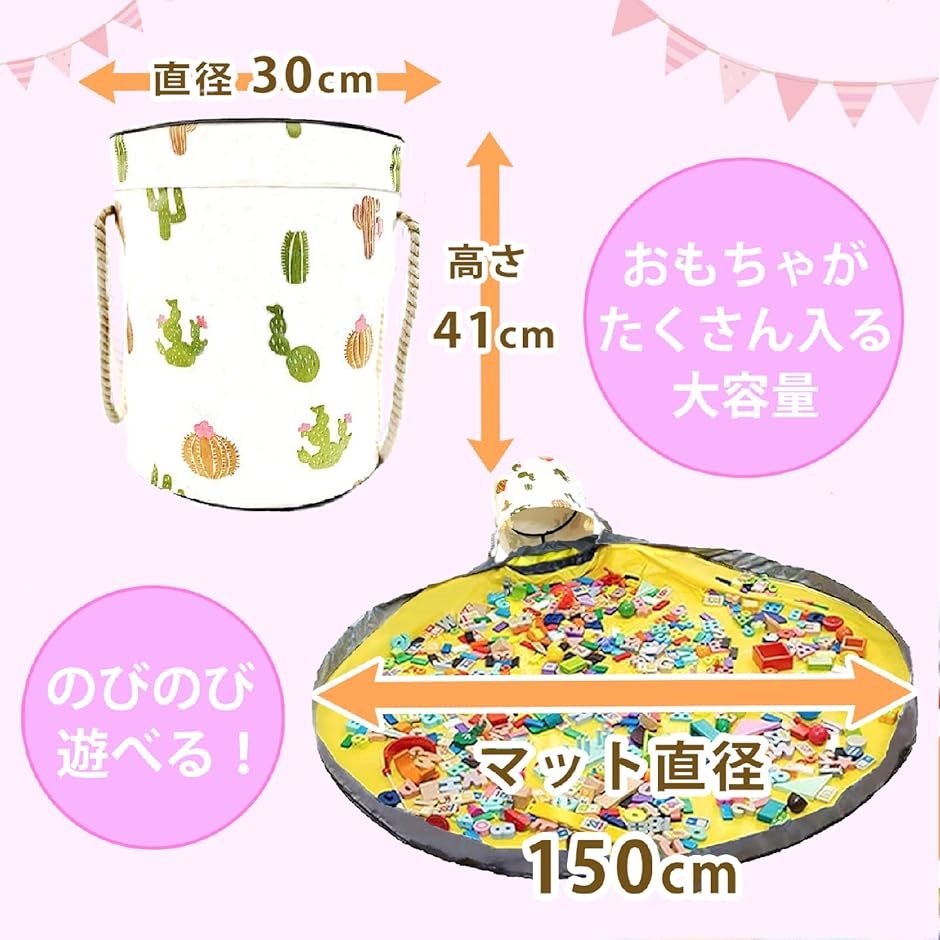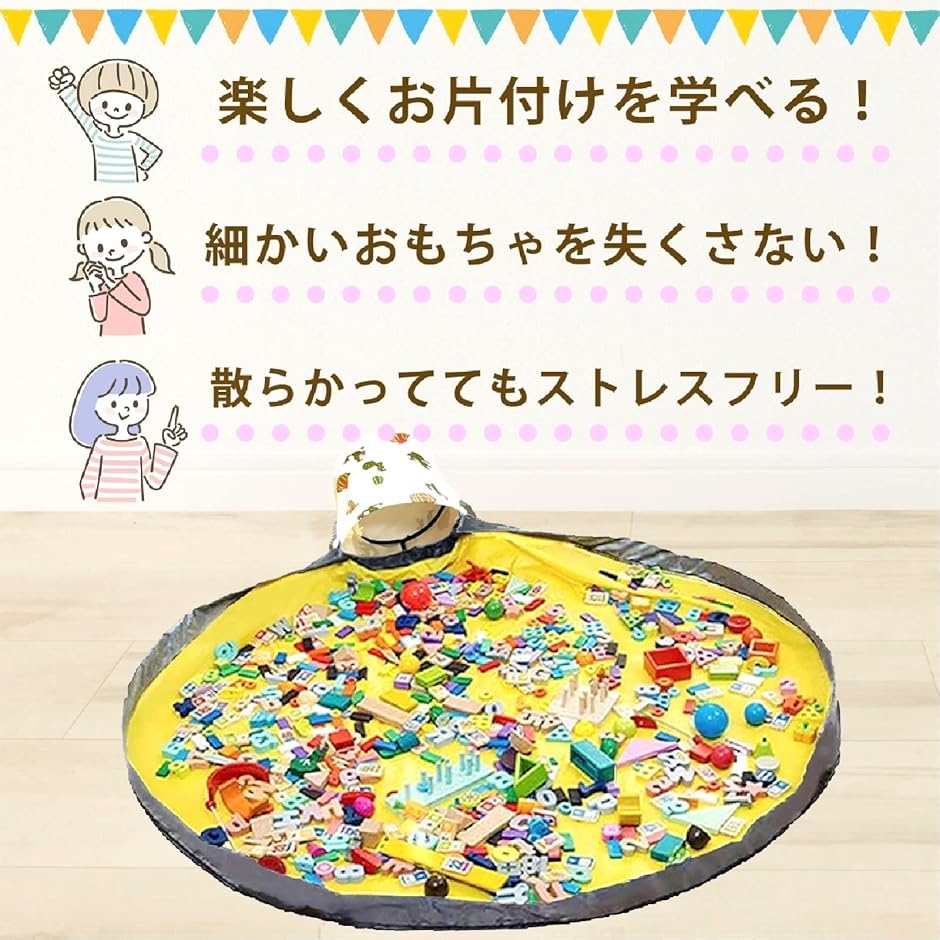 見た目はコンパクトですが中を広げると大容量。。。付属するプレイマットの上で遊んで頂ければお片付けが簡単。もちろんお子様の利用だけでなく、大人も収納袋として、お部屋のインテリアとしてもご使用頂けます。