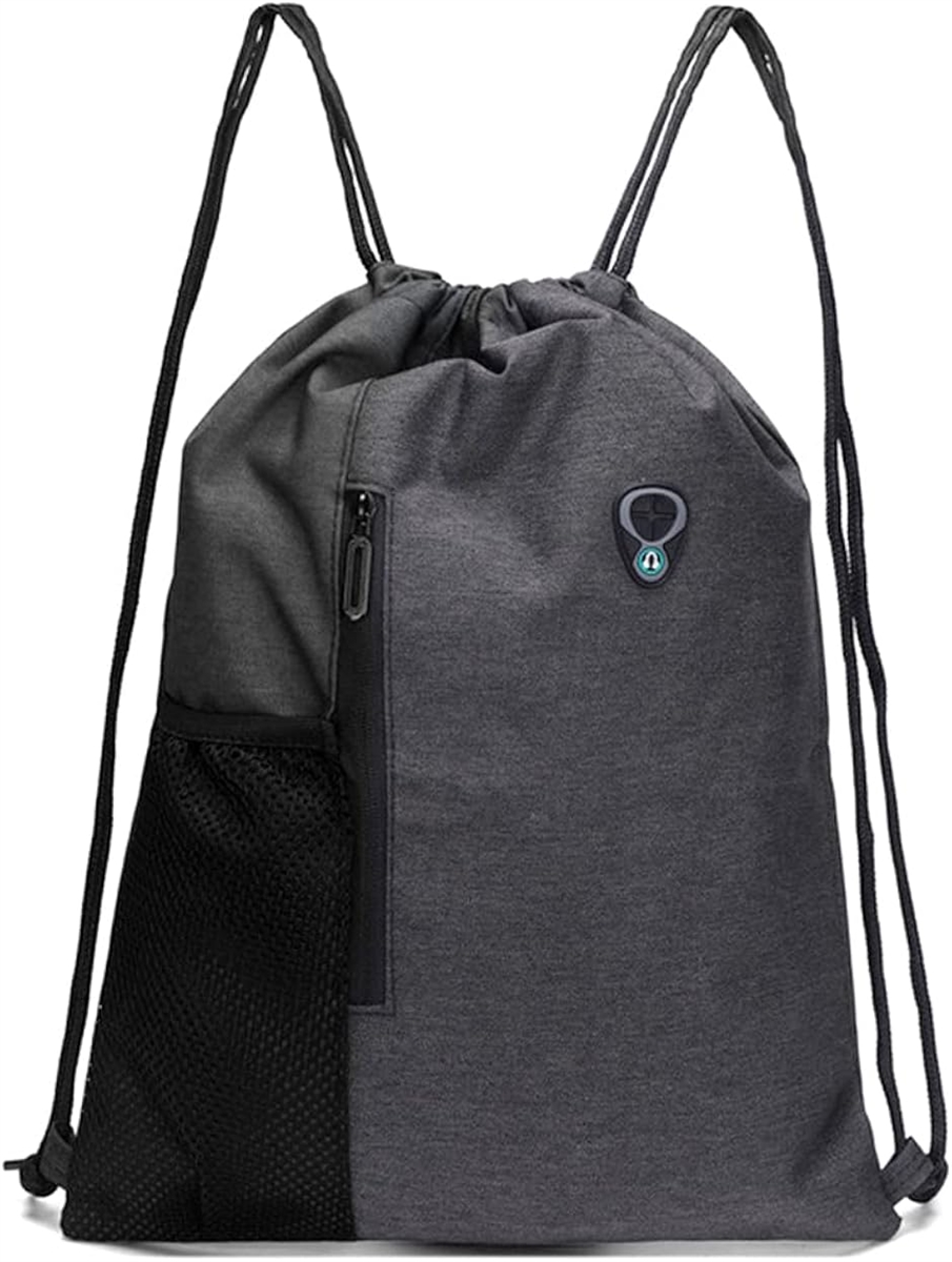 シンプルな無地の巾着タイプで、イヤホンホールやキーフックもついた機能的なジムサックです。